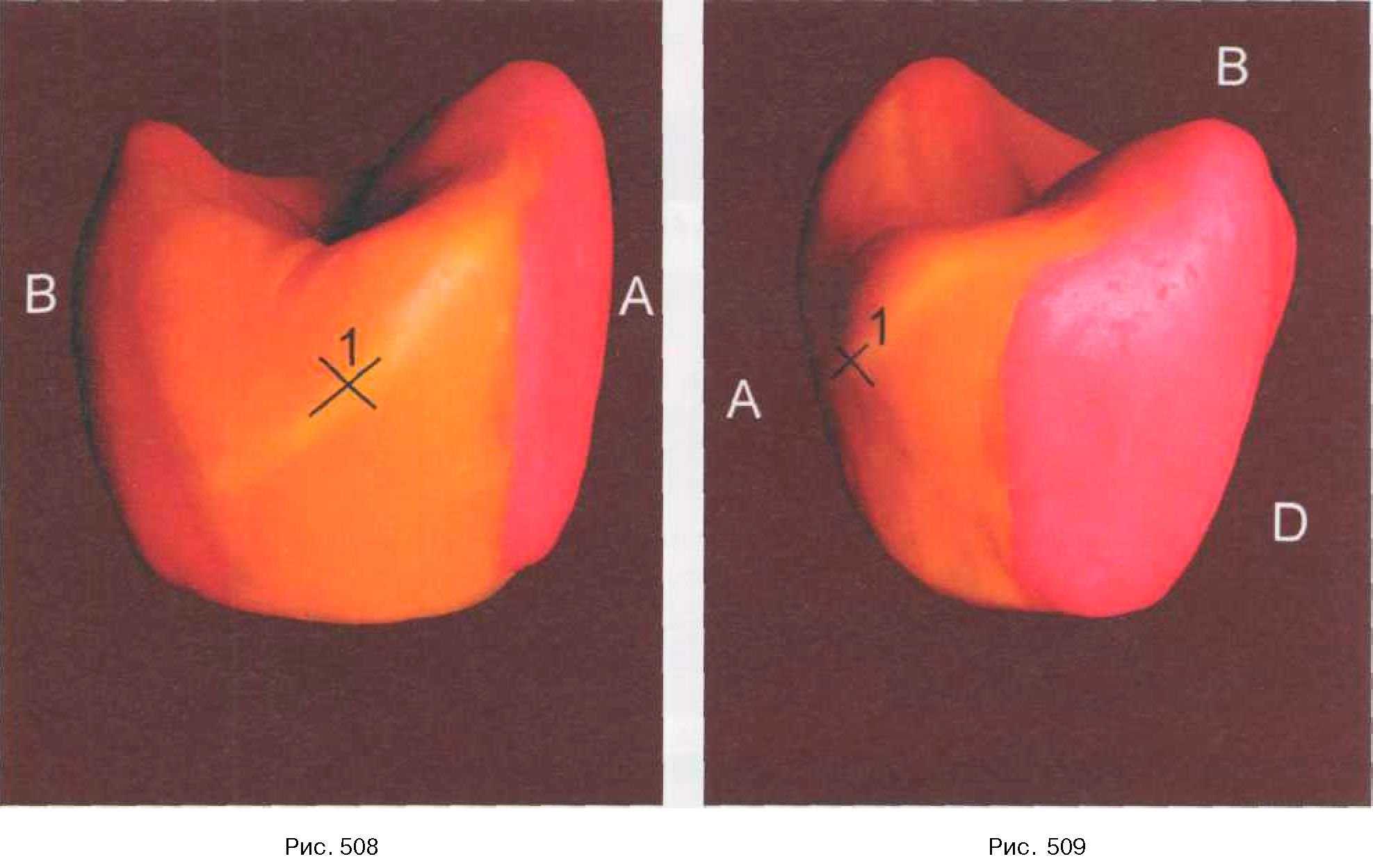 При оформлении дистальной контактной поверхности прокладываем косой валик, берущий начало от вершины дистального бугра вестибулярного одонтомера, оканчивающийся в цервикальной трети небного одонтомера (рис. 508, 509). На середине его протяженности, на границе режущей и средней трети коронки зуба формируем межзубной контактный пункт (1).