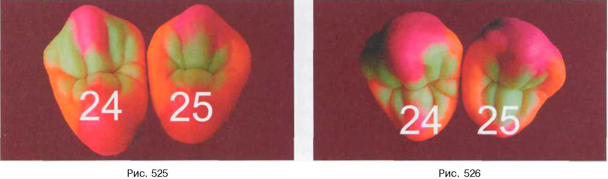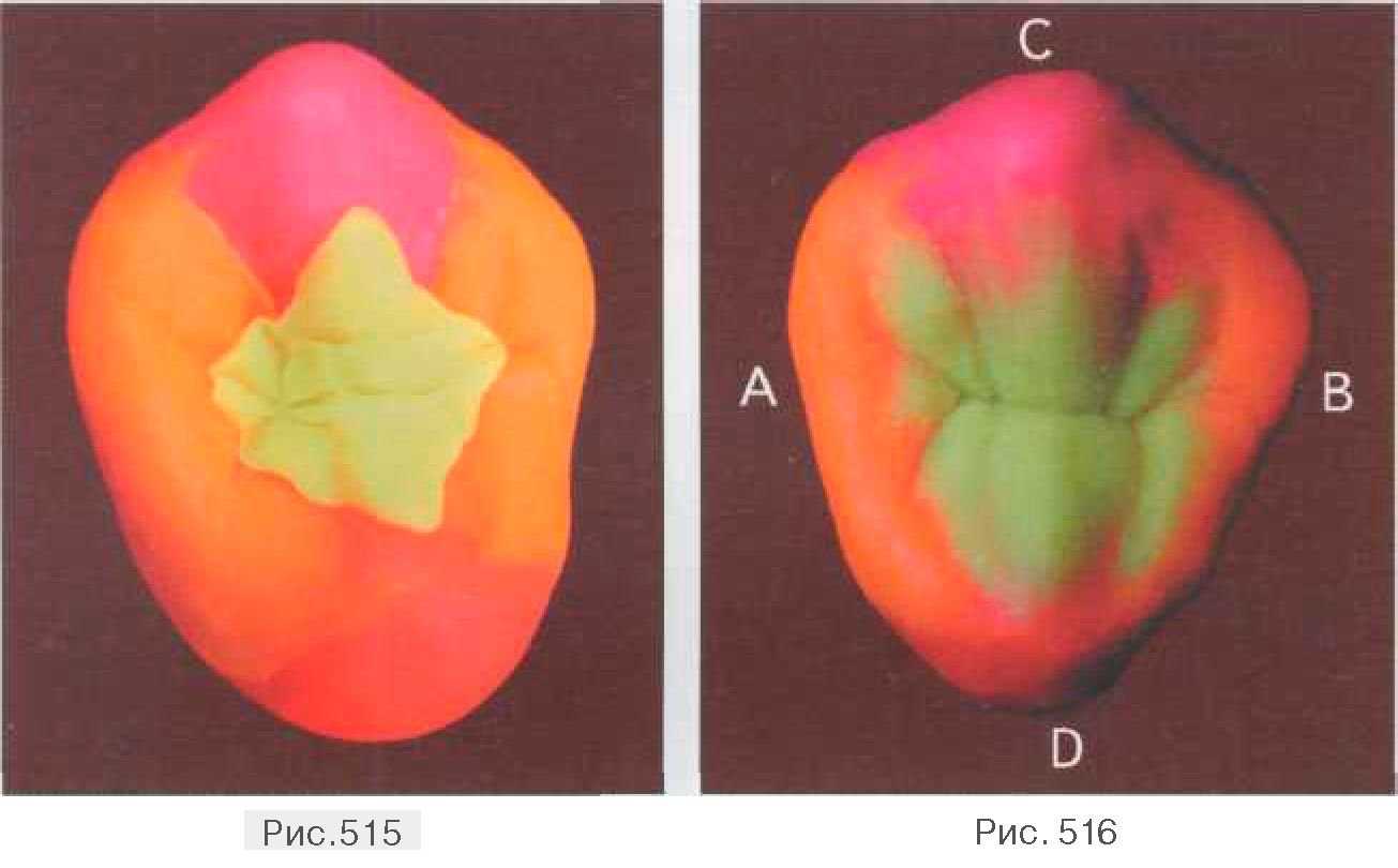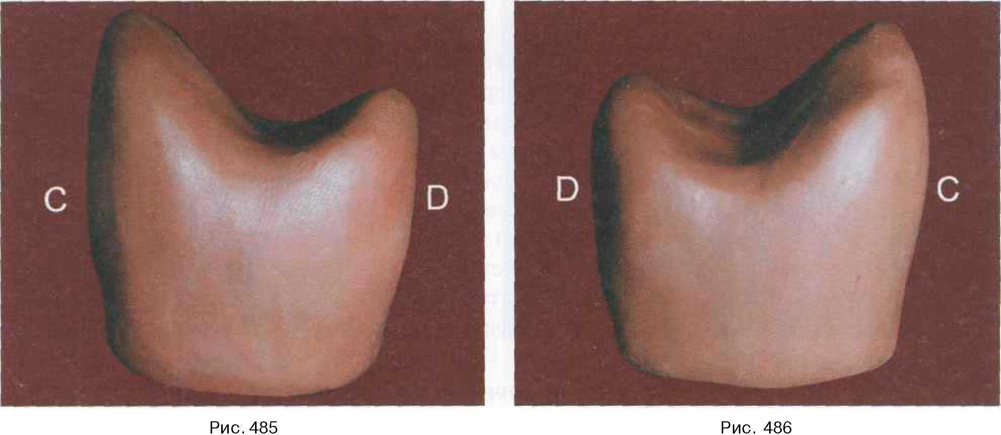 На данном заключительном этапе моделирования проявляются внутреннее состояние профессионала, его знания в области анатомии, рисунка, лепки. Есть возможность проявить свое умение, так как незначительно изогнутая линия по поверхности, плавный переход одного элемента в другой придают вашей конструкции грациозность, изысканность, индивидуальность. Демонстрируется окончательный вариант моделирования коронки верхнего левого второго премоляра с различных ракурсов (рис. 517-522). После описания и демонстрации основных этапов моделирования верхних премоляров показано взаиморасположение коронок зубов по отношению друг к другу, их единство и отличительные признаки (рис. 523-526).