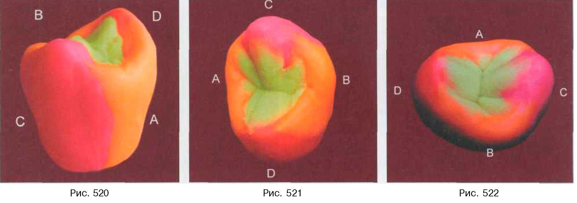 Серия рисунков демонстрирует коронку верхнего левого второго премоляра после проведения основных этапов моделирования с различных позиций (рис. 510-514)
