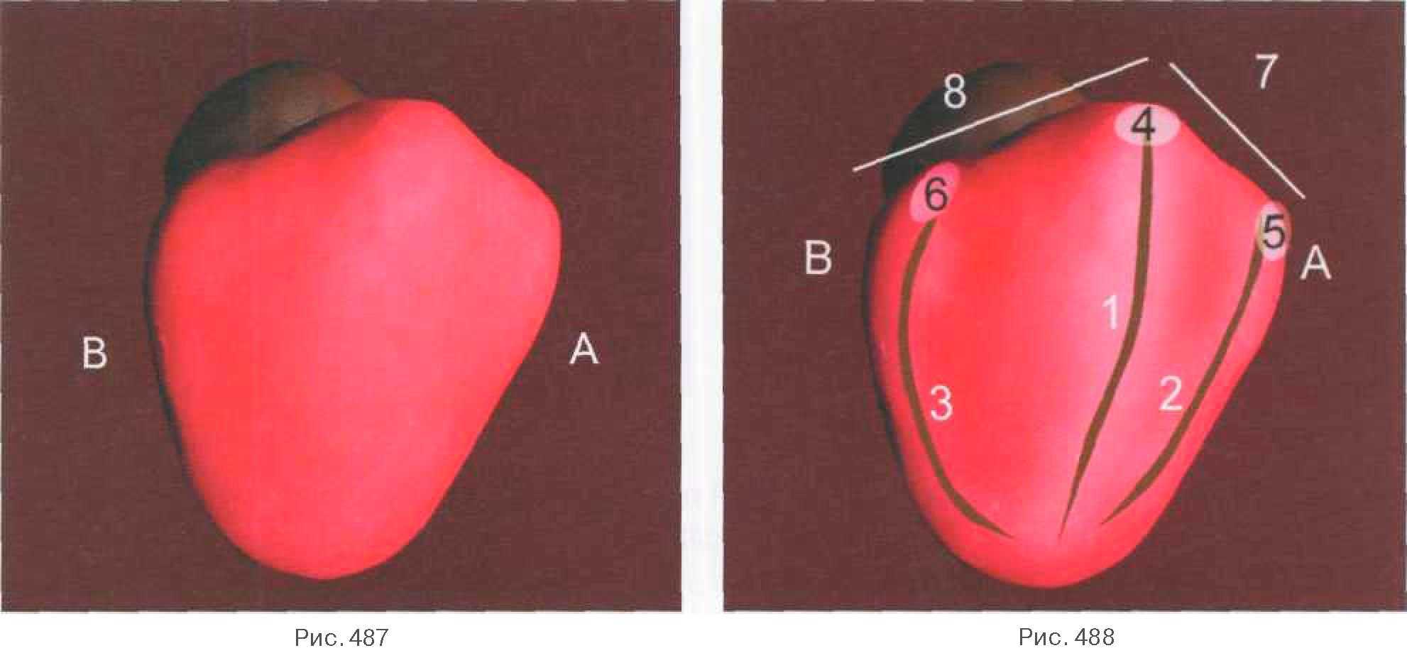 Закладываются максимально полно основные морфологические элементы: продольный валик (1), медиальный валик (2), дистальный валик (3). Продольный валик имеет дугообразный медиальный изгиб по ходу вестибулярной поверхности, заканчивается рвущим бугром, имеющим сглаженную вершину (4). Продольный валик подразделяет поверхность на две неравные части: медиальная имеет меньшую площадь, дистальная — большую. Медиальное ребро (7) режущего края вестибулярной поверхности короче дистального (8), что является характерным признаком, характеризующим принадлежность зуба к левой стороне. Каждый из боковых валиков на режущем крае вестибулярного одонтомера образует свои бугорки (медиальный — (5), дистальный — (6)). Основные морфологические элементы отделены друг от друга слегка заметными углублениями. Обратите внимание, что вместе с заполнением вестибулярной поверхности моделируется также и вестибулярная часть жевательной поверхности (рис. 489-491).