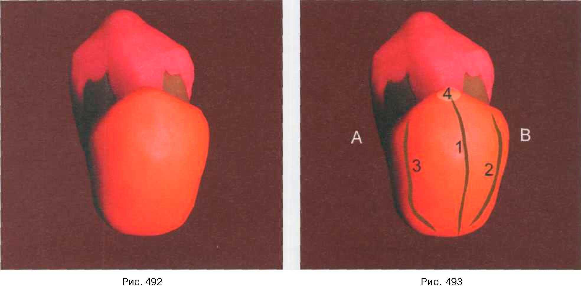 Также моделируются медиальная и дистальная части небного одонтомера. Практически 2/3 поверхности внутренней части жевательной поверхности со стороны небного одонтомера заполняются медиальным (5) и дистальным (6) валиками. Основные морфологические элементы отделены друг от друга незначительными углублениями. Начинается также формирование краевых гребней (медиального — (7), дистального — (8)). Демонстрируется внешний вид коронки со стороны контактных поверхностей: медиальной рис. 497 и дистальной рис. 498. После построения основных вестибулярного (1) и небного (2) одонтомеров отмечается практически их одинаковая высота, что является отличительным признаком между первым и вторым верхними премолярами. Контур вестибулярной поверхности (3) практически прямой на всем протяжении, за исключением цервикаль- ной трети коронки зуба. Контур лингвальной поверхности (4) равномерно выпуклый по всей длине, постепенно изгибающийся в вестибулярном направлении.