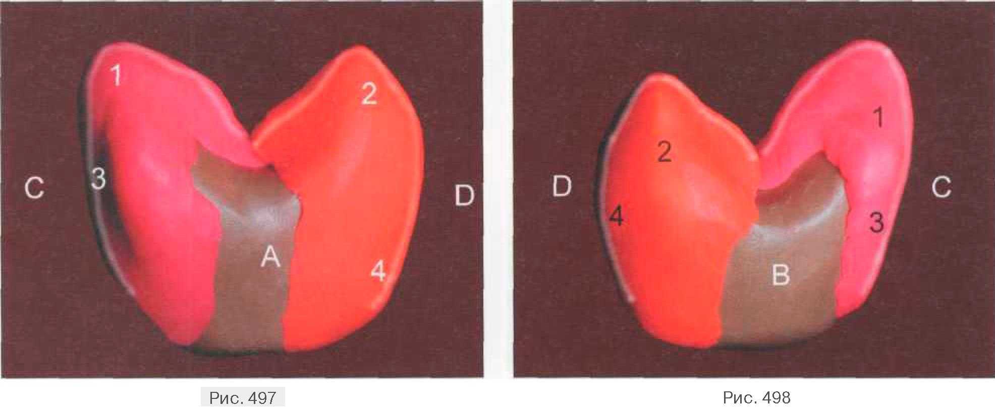 Продольный валик (1) занимает большую площадь вестибулярного одонтомера по жевательной поверхности, выкладывается в виде широкой складки, стремящейся к центральной фиссуре. Также начинаем формировать медиальный валик (2), берущий начало от медиального возвышения, направляющийся к медиальной части центральной фиссуры. Заполняется примерно 1/2 часть внутренней поверхности вестибулярного одонтомера. Дистальная часть оформляется путем формирования дистального валика (3), при этом заполняется примерно 1/3 часть внутренней поверхности вестибулярного одонтомера. Далее происходит восстановление небной поверхности с соблюдением смещения массы рвущего бугорка (4) небного одонтомера в медиальную сторону (рис. 492, 493)