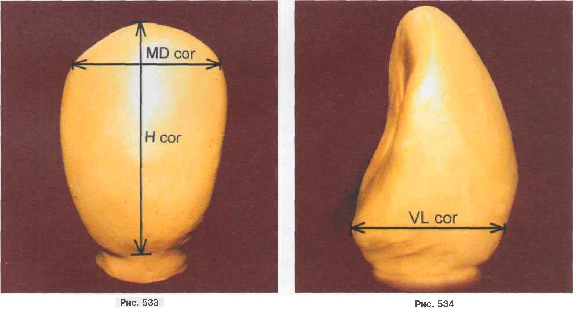 Из подручного материала (пластилин) создается заготовка (культя зуба) определенного объема, где исполняется выбранный заранее масштаб. Высота коронки (Н сог) определяется по вертикали от рвущего бугра до предполагаемой анатомической шейки (рис. 533). Длина коронки (MD сог) — крайние точки медиального и дистального краев коронки находятся примерно на границе ее верхней и средней трети (рис. 533). Ширина коронки (VL сог) — наиболее выступающие точки вестибулярной и лингвальной поверхностей в цервикальной трети коронки (рис. 534). Работая с подручным материалом рекомендуем воспользоваться пропорциональным соотношением величин Нсог: MD сог : VL сог. Таким образом, высота коронки нижнего клыка превалирует над его длиной и шириной, при этом ширина коронки лишь незначительно превышает его длину. Имеющийся расчет соотношений частей в определенных пропорциях помогает исполнителю сделать заготовку коронки клыка нижней челюсти достаточных размеров для последующей работы с ней. С учетом анатомических особенностей нижнего клыка, постепенно моделируется его форма, воссоздаются внешние очертания, наружные контуры.