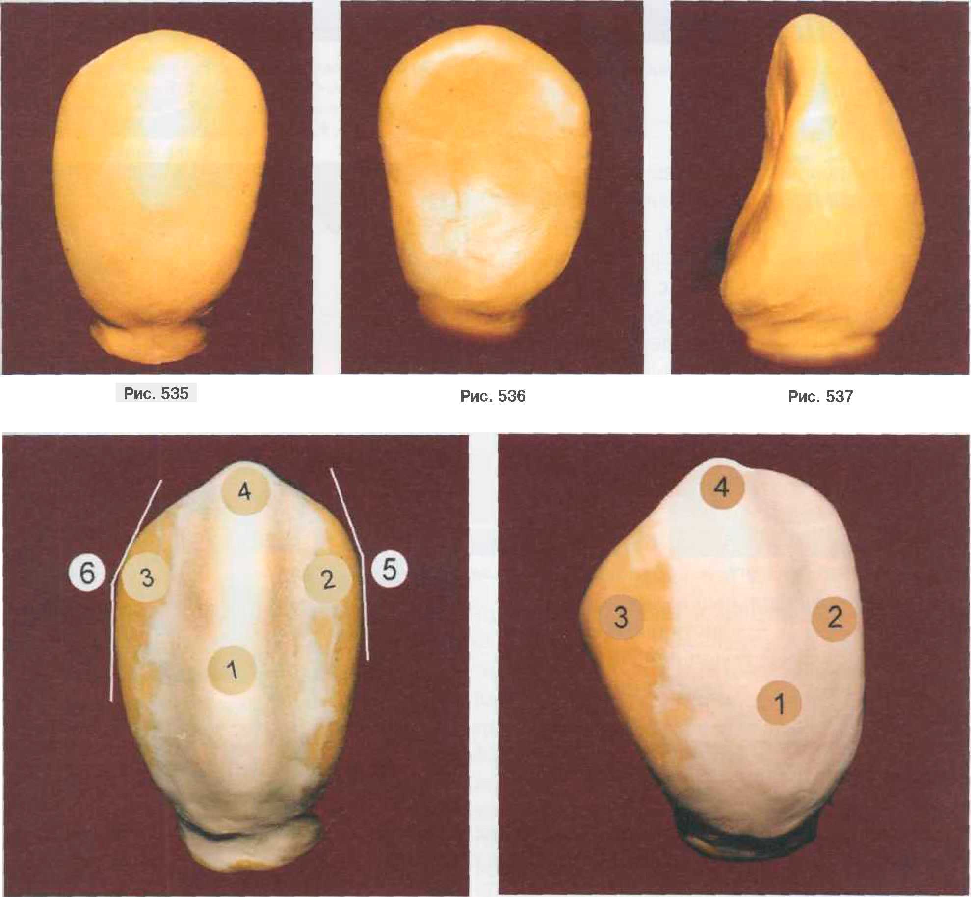 На начальных этапах моделирования вестибулярной (рис. 535) и небной (рис. 536), поверхностям придается форма овоида. Форма контактных поверхностей напоминает равнобедренный треугольник (рис. 537). При моделировании вестибулярной поверхности нижнего клыка сформированный продольный валик создает основную выпуклость зуба и делит его поверхность на две неравные части: меньшую — медиальную и большую — дистальную. На режущем крае продольный валик переходит в рвущий бугор, вершина которого смещена к контактной медиальной поверхности. Таким образом, медиальный отрезок режущего края короче дистального (рис. 538). Обратите внимание, что уже на начальных этапах моделирования заданы формы основным морфологическим и структурным элементам. Далее формируется медиальный валик (2), более длинный и отвесный (почти вертикально расположенный). При слиянии с режущим краем образует медиальный угол (расположенный выше дистального угла), нередко имеющий собственную вершину (рис. 539).