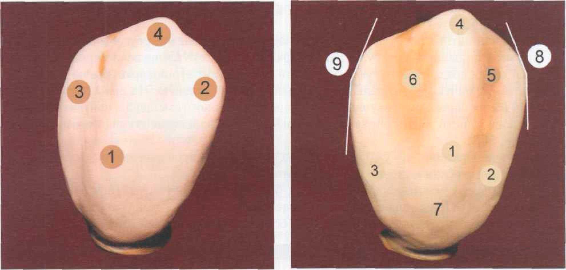 Сформированный дистальныи валик (3) короче медиального, при слиянии с режущим краем образует тупой, закругленный угол, расположенный примерно на границе верхней и средней трети (рис. 540). Из образовавшихся между валиками углублений медиальное (5) более выражено. В пришеечной области три валика, плавно сливаясь друг с другом, образуют экватор (7) (рис.541). Каждому из вышеуказанных валиков на режущем крае соответствуют бугорки, а углублениям — вырезки. На небной поверхности бугорки режущего края переходят в соответствующие валики: 1 — продольный валик, 2 — медиальный валик, 3 — дистальныи валик, а вырезки в соответствующие углубления: 6 — медиальное, 7 — дистальное углубление (рис. 542). Достаточно часто встречается вариант сглаживания основных морфологических элементов небной поверхности. Краевые валики могут быть сильно выражены, и небная поверхность приобретает лопатообразную форму. Также для нижних клыков характерна односторонняя лопатообразность, когда дистальныи валик выражен сильнее медиального. Чем сильнее выражены краевые валики, тем менее выражен продольный и наоборот. В пришеечной области все три валика тянутся к лингвальному бугорку, который не имеет собственной вершины и обычно слабо выражен.
