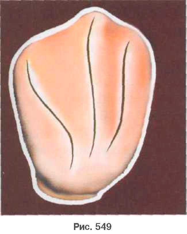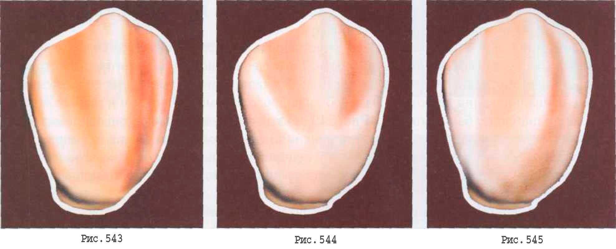 Образующееся при этом относительно свободное пространство между дистальным и продольным валиками меняет продольную направленность зуба, создается оптическая иллюзия наклона поверхности зуба в медиальную сторону. На рис. 547, 548 показан вариант множественных проявлений основных и дополнительных валиков на вестибулярной поверхности. Увеличение числа морфологических структур придает поверхности признаки складчатости, дифференциации, объемности; создается ощущение превалирования широтных размеров над продольными, при одном и том же ограничительном шаблоне (белый контур). Рис. 549 показывает S-образный изгиб основных валиков (коричневые линии) по всему ходу коронки (клыка). Присутствие плавных линий, мягкого перехода геометрических поверхностей основных и дополнительных морфологических элементов придают коронке нижнего клыка грациозность, сглаженность, уравновешенность внешних форм. Таким образом, представленный ансамбль коронок вестибулярных поверхностей нижних клыков показывает достаточное разнообразие их внешних форм. Степень их вариабельности может быть бесконечной, незначительный штрих в изменении направленности хотя бы одной геометрической поверхности рождает новые формы. Явления дифференциации, постоянно встречающиеся в природе, а также у каждого индивидуума необходимо своевременно распознать, а рука реставратора должна вписаться в индивидуальную гармонию зубочелюстного аппарата пациента при исполнении реставрационных работ. |