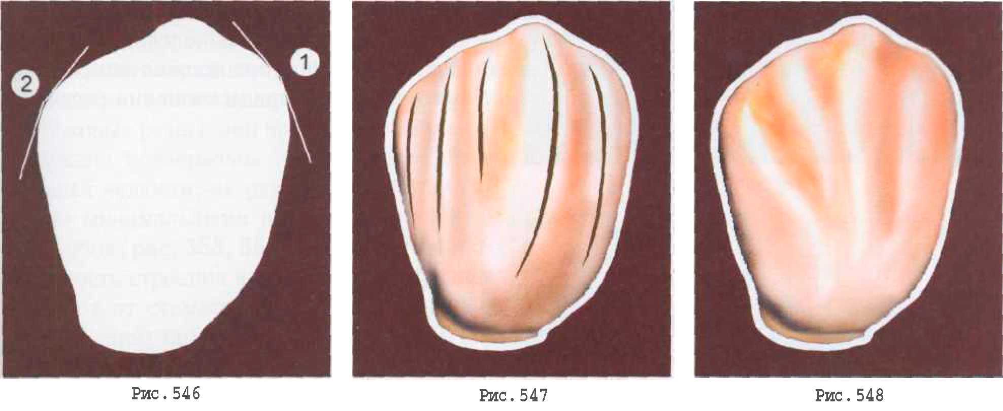 новых форм происходит за счет изменения конфигураций морфологических элементов, их количества и качества геометрических поверхностей. Достаточно изменить незначительно направление хотя бы одного морфологического элемента по поверхности и конечный результат меняется. На рис. 543 показан вертикальный ход основных валиков (медиальный, продольный и дистальный), равномерно располагающихся по ходу коронки, тем самым придающие ей утонченность, грациозность, создается эффект вытянутости формы. Рис. 544 показывает также наличие трех основных валиков, однако расположение их по поверхности совершенно иное и отличается от предыдущего случая, хотя габаритные очертания стандартные (белая линия). Валики занимают режущую и половину средней трети коронки зуба, располагаясь аркоподобно, плавно сливаясь между собой, образуя достаточно хорошо выраженный экватор. Смоделированная таким образом форма коронки вестибулярной поверхности придает нижнему клыку своеобразную объемность. Рис. 545 отображает ход основных валиков по поверхности коронки, отмечается выраженный дугообразный изгиб продольного валика в медиальную сторону, изменяется конфигурация поверхности.
