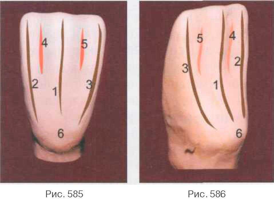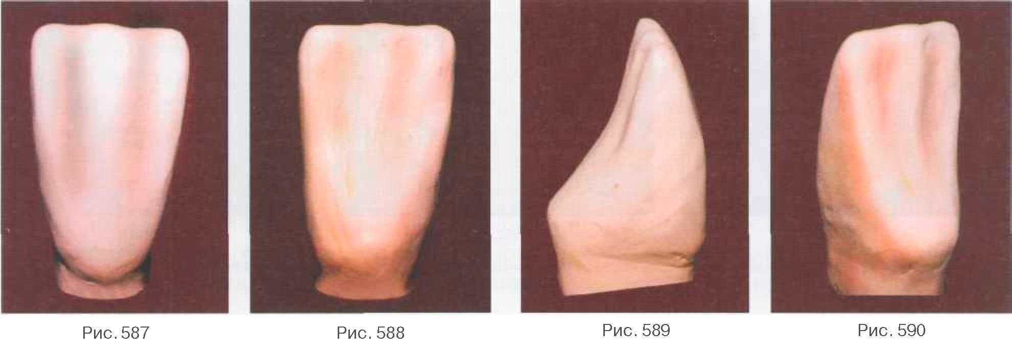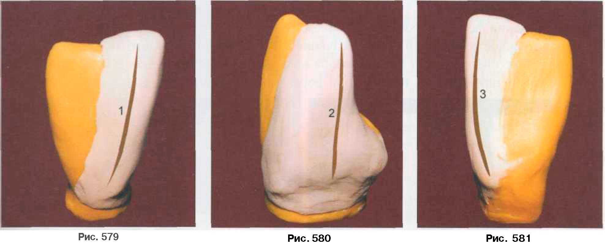 части коронки форму долота (рис. 579). Далее наносим часть пластилина и на контактную поверхность, формируя дистальную грань (2), где уже более четко прослеживается ее наклон от шейки к режущему краю коронки (рис. 580). Заканчиваем моделирование дистальнои части коронки нанесением материала на язычную поверхность (3). Здесь уже выделяется часть язычного бугорка, оформляется краевой валик с язычной поверхности, имеющий определенный изгиб в средней трети коронки (рис. 581). Далее формируем медиальную часть коронки 31 зуба. Аналогично дистальнои части зуба моделируем краевой валик (1) по вес-