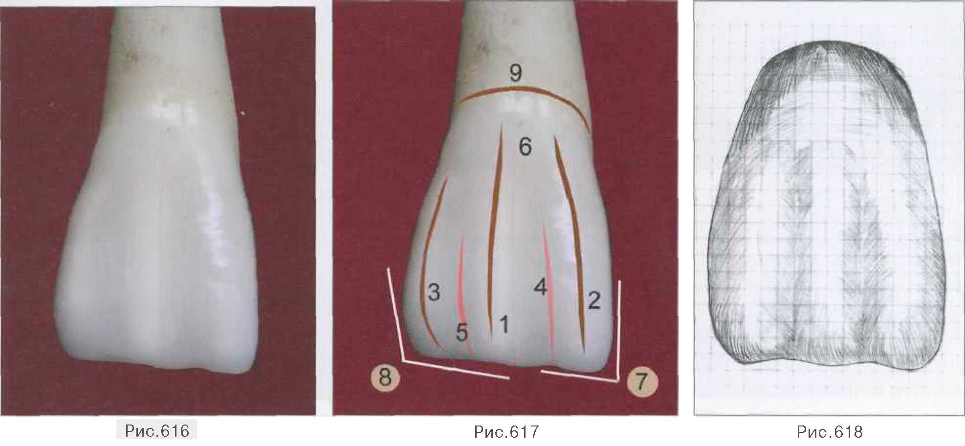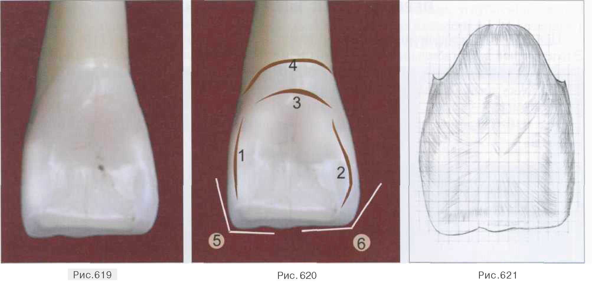 Режущий край в дистальном отделе незначительно скошен и приподнят, за счет чего прослеживается разница между медиальным и дистальным углами. Вестибулярная поверхность не является плоской, здесь располагаются три валика (мамелона): продольный — (1), медиальный — (2) дистальный — (3), между которыми прослеживаются незначительные углубления: медиальное — (4), дистальное — (5). Продольный валик имеет пологие скаты, гребень, объединяющий их, практически не выражен и заканчивается на режущем крае слабовыраженным возвышением эмали. Краевые валики, образующие контактные поверхности, конвергируют, при этом наблюдается вогнутость на медиальной поверхности и незначительная выпуклость на дистальной поверхности, что придает коронке зуба очертания трапеции. Сами валики образованы пологими скатами, также заканчиваются на режущем крае незначительными возвышениями эмали. На границе средней и пришеечной трети продольный и краевые валики сливаются между собой, образуя экватор зуба (6). Медиальное и дистальное углубления представлены неглубокими канавками, идущими практически параллельно, заканчивающимися вырезками на режущем крае. Небная поверхность коронки 11 зуба представлена на рис. 619-621. Небная поверхность верхнего правого центрального резца также имеет форму трапеции. Аналогично вестибулярной поверхности просматриваются острый, ниже расположенный медиальный угол (5) коронки и округлый дистальный (6). Однако на данной поверхности