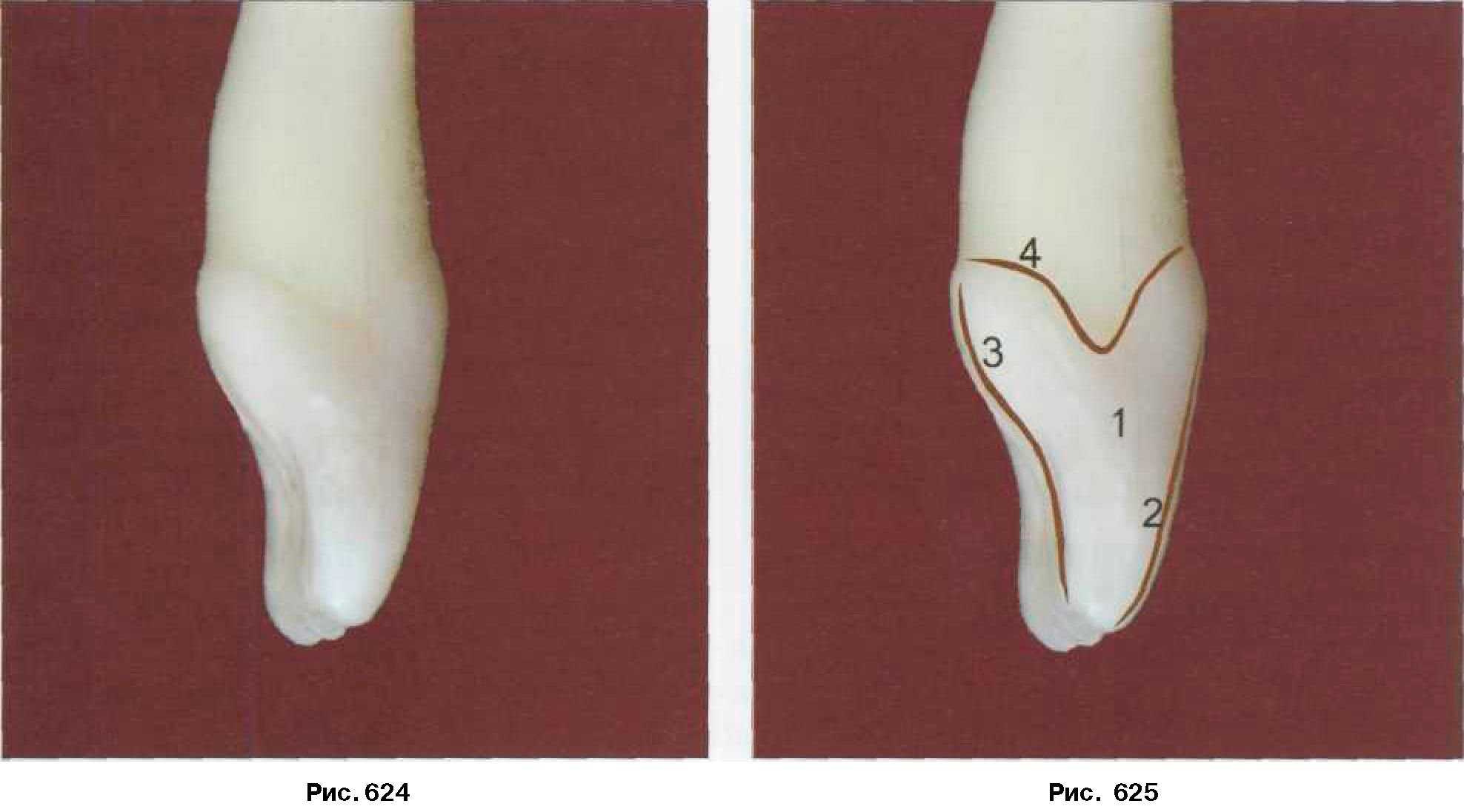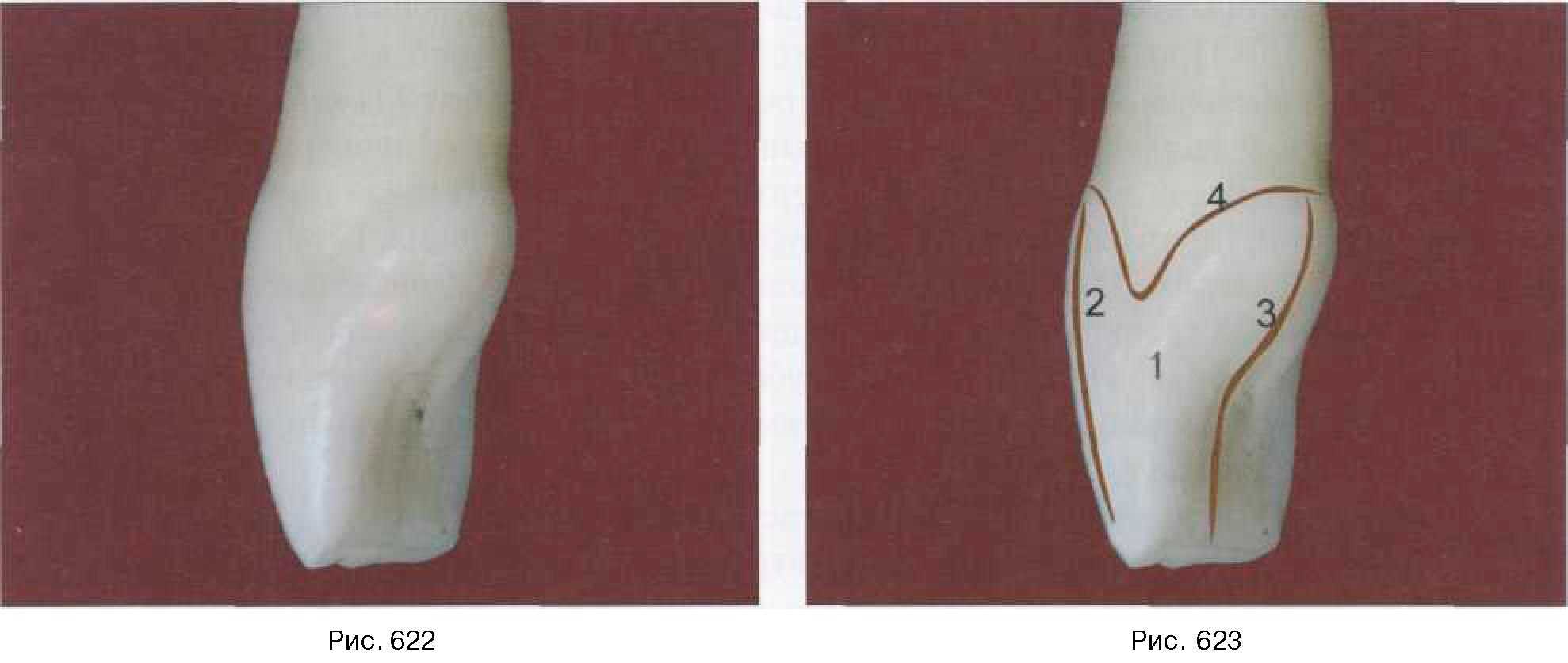 Вестибулярный контур (2) имеет равномерный плавный наклон к режущему краю, небный контур (3) выпуклый в пришеечной области за счет развития цервикального пояска, вогнут в средней и режущей трети. Контактная дистальная поверхность (1), представленная в виде клина, аналогична строению передней контактной поверхности (рис. 624, 625).