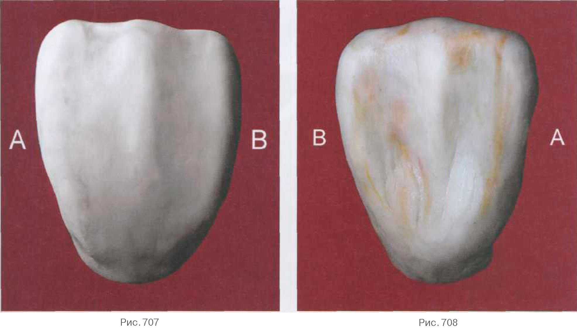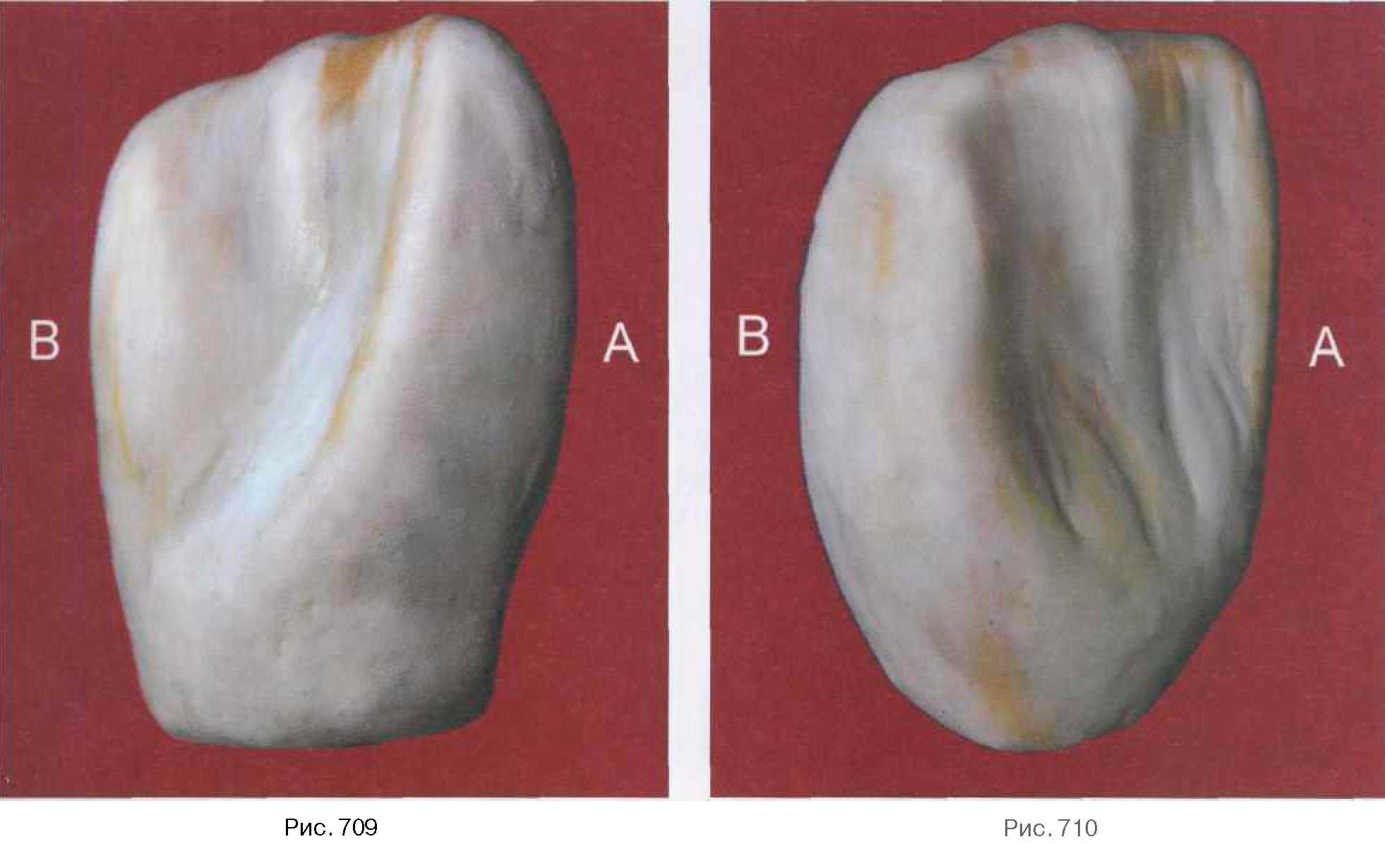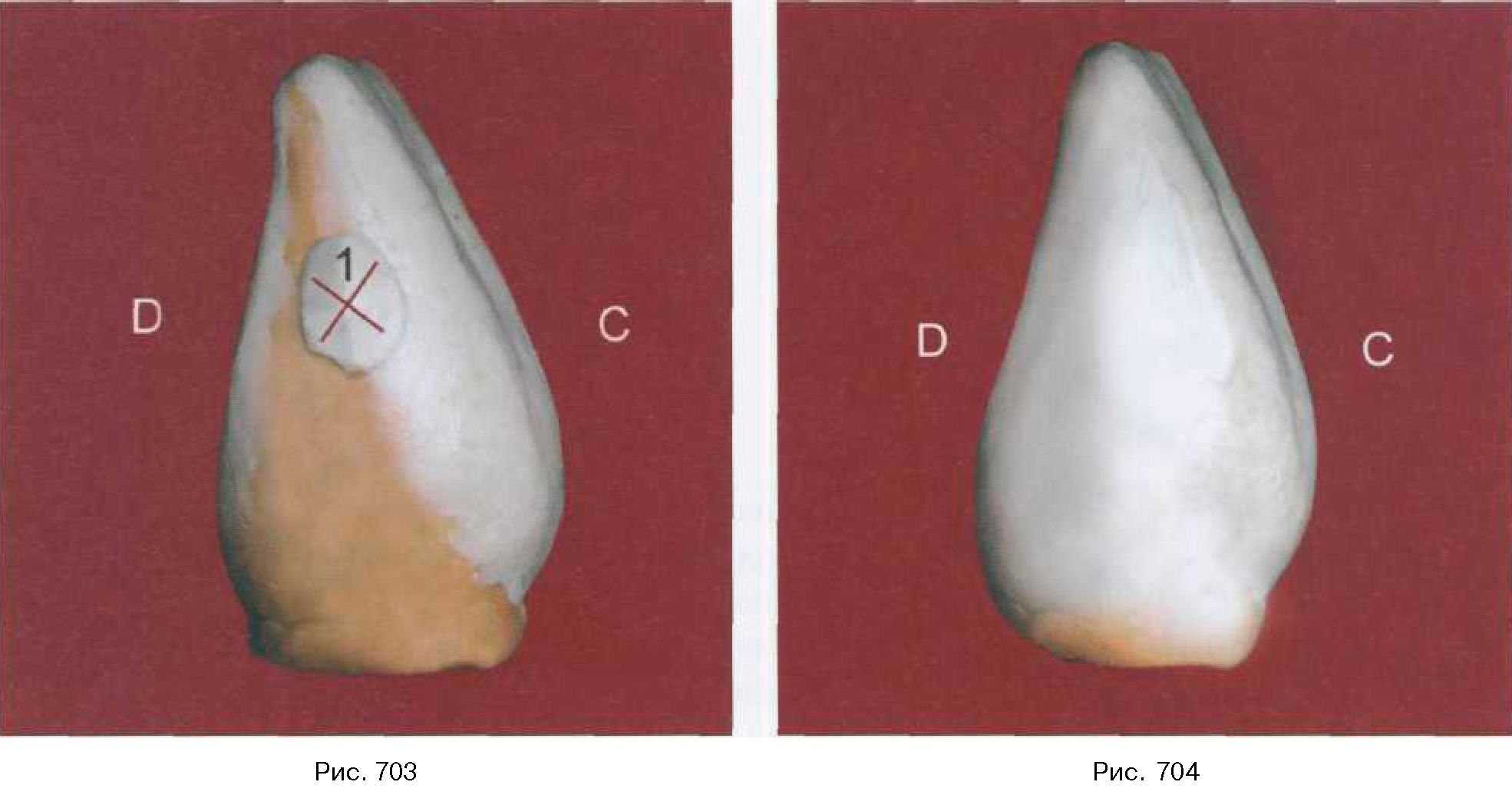 дистальный— (9), которые занимают пространство между краевыми и продольным валиками, за канчиваясь в средней трети коронки бокового резца. После их нанесения дифференциация небной поверхности усиливается, образуется своеобразный микрорельеф. При моделировании медиальной контактной поверхности оформляем зону максимальной выпуклости коронки бокового резца (рис. 703, 704).