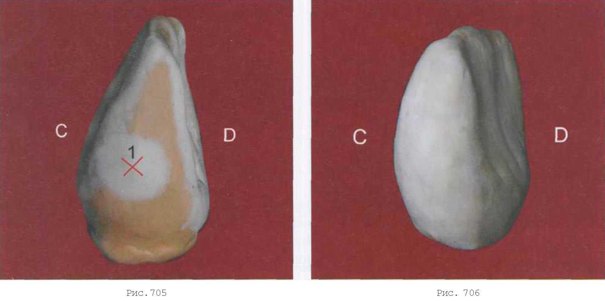 Выкладываем небольшое возвышение, располагающееся в средней части коронки зуба (1), затем объединяем медиальные валики вестибулярной и небной поверхностей, заполняя просранство, напоминающее форму треугольника, верхушка которого направлена к режущему краю, основание кдесневому. Аналогичным образом происходит моделирование дистальной контактной поверхности (рис. 705, 706). Зона максимальной выпуклости коронки располагается в средней ее части,