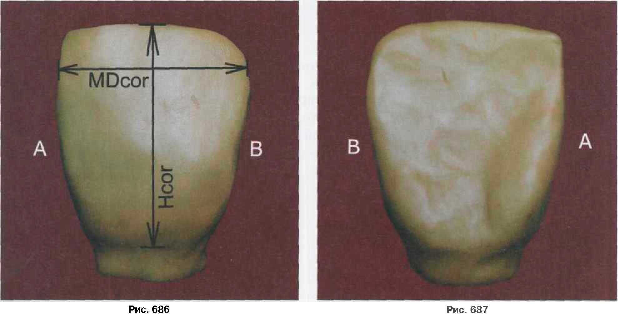 Со стороны вестибулярной (рис. 686), небной (рис. 687), режущей (рис. 688) поверхностей заготовка коронки напоминает форму трапеции, меньшее основание которой направлено к десневому краю, большее — к режущему. Со стороны контактных медиальной (рис. 689), дистальной (рис. 690) поверхностей заготовка имеет форму треугольника, верхушка которого обращена также к режущему краю, основание к десневому краю. |