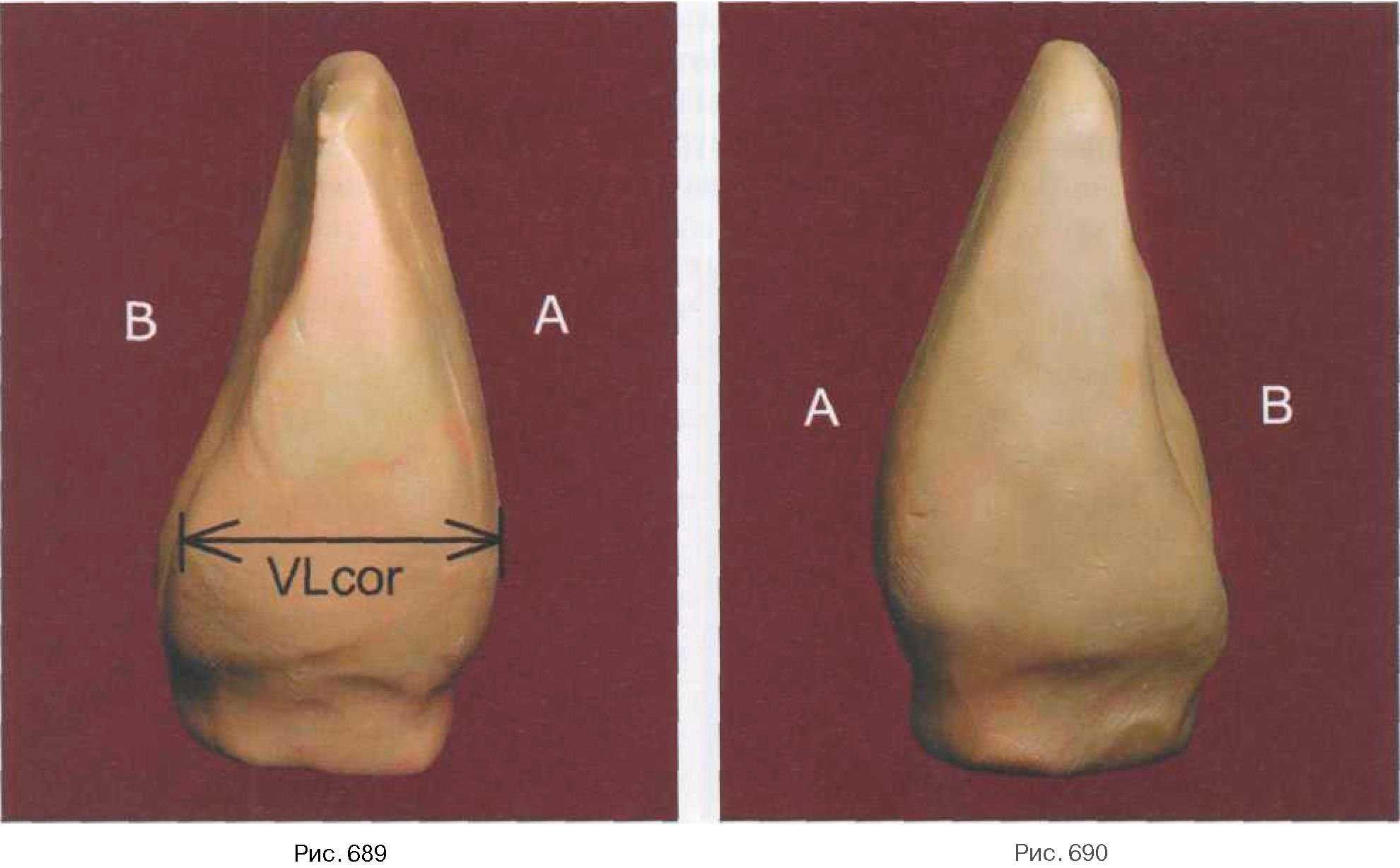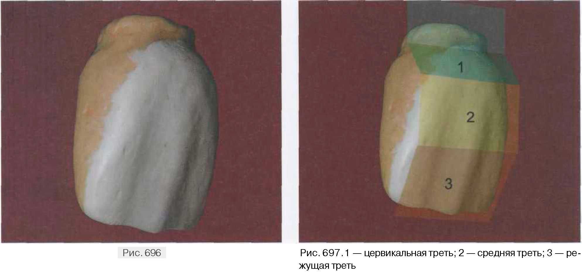 Затем выстраиваем также пологий дистальный валик (2), берущий начало от дистального угла коронки, заканчивающийся в цервикальной ее трети. Сформированные краевые валики контурируют боковые грани верхнего правого латерального резца, придавая вестибулярной поверхности трапециевидные очертания. Постепенно оформляются четче выраженный медиальный угол (3) коронки, и округлый дистальный угол (4), что в клинической стоматологии помогает правильно определить признак принадлежности зуба к той или иной стороне. Далее заполняем среднюю треть коронки верхнего правого латерального резца (рис. 694, 695). Формируем продольный валик (3), который создает на режущем крае незначительное возвышение, а в цервикальной трети участвует в образовании экватора коронки.
