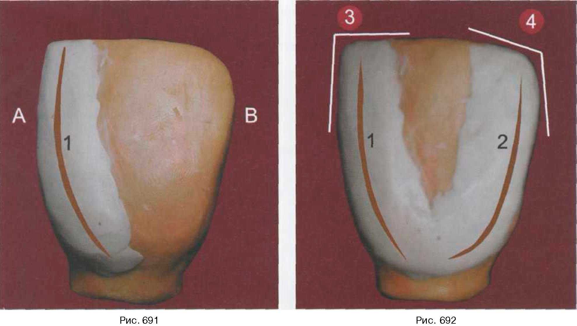 Таким образом, изначально задан объем коронки зуба, ограниченный габаритными очертаниями (высота коронки, ширина коронки, толщина коронки). Занимаемся оформлением вестибулярной поверхности (рис. 691-693). Выкладываем пологий медиальный валик (1), идущий от медиального угла коронки, незначительно изгибающийся в ее цервикальной трети.