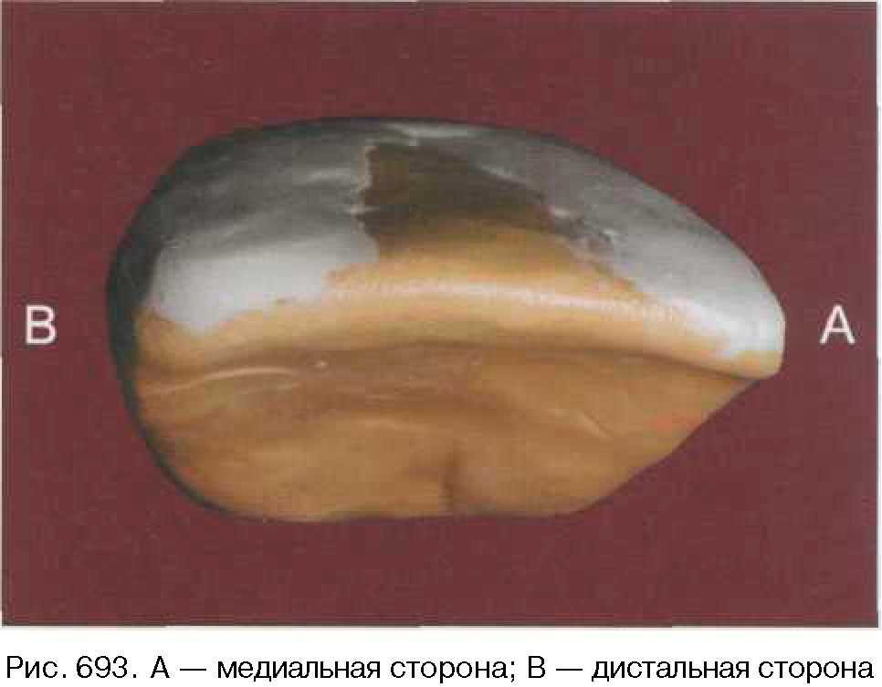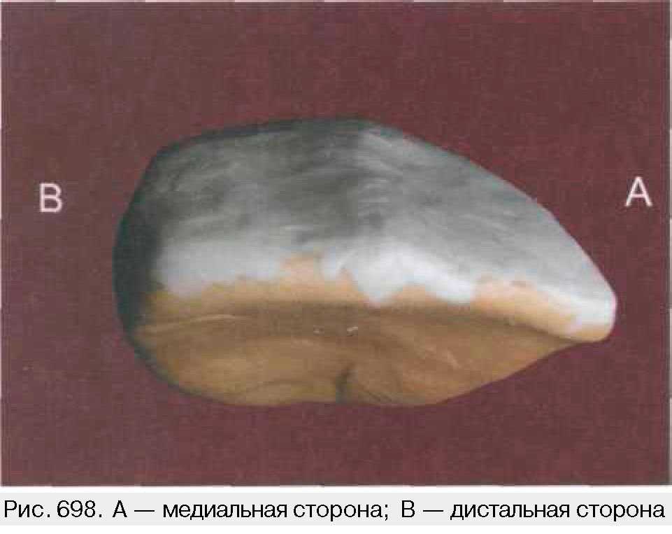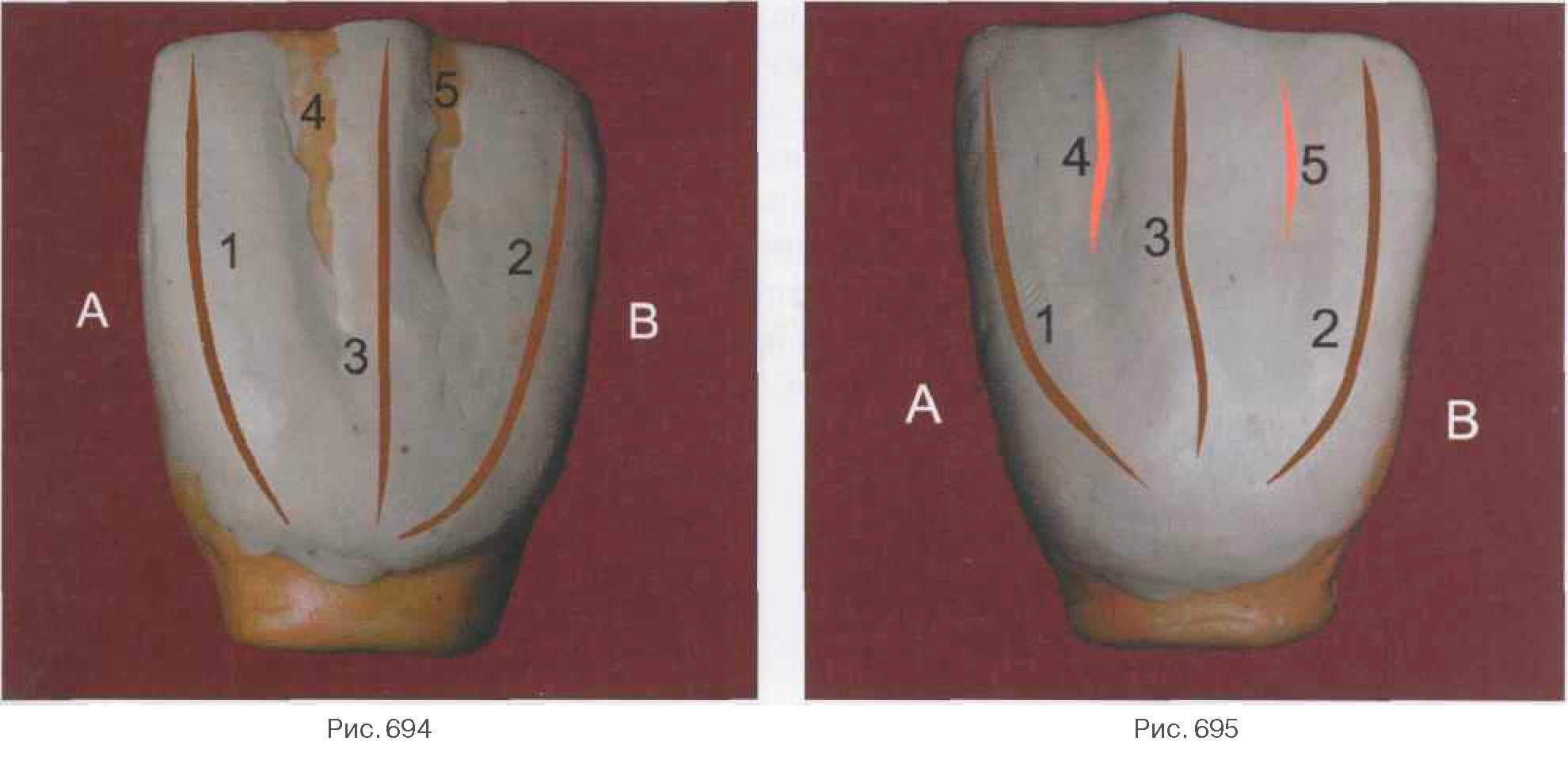 Созданные валики (медиальный — (1), дистальный — (2), продольный — (3)) соответствуют мамелонам (эмалево-дентинным валикам) коронки, между которыми образуются углубления в виде незначительных канавок (медиальное — (4), дистальное — (5)). Рис. 696, 697 отображают ход, направленность основных морфологических элементов, которые задают соответствующий рельеф вестибулярной поверхности верхнего правого латерального резца. Демонстрируется характерная конфигурация вестибулярного контура при обзоре коронки латерального резца с дистовестибулярной стороны. Цервикальная треть коронки (1) имеет выпуклость и соответственно этому, элементы, расположенные в данной морфологической зоне, располагаются в определенной плоскости, которая направлена вестибулярно, кнаружи. В средней трети (2) направленность морфологических элементов со вершенно иная, а плоскость, в которой они располагаются, имеет вертикальный ход.