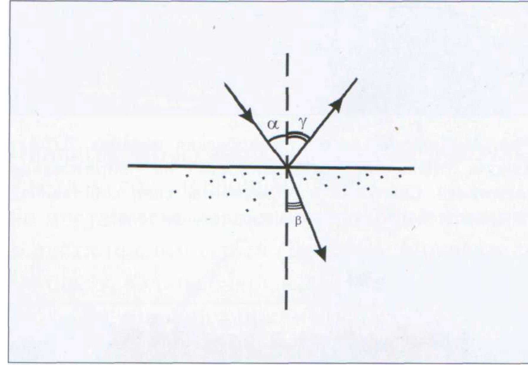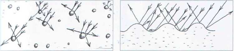 Встречая на своем пути преграду, на границе двух сред луч света меняет направление. Часть светового пучка возвращается в первую среду, т.е. отражается. Вторая часть переходит в другую среду (если та прозрачна), однако при этом меняет направление — преломляется (рис. 4). По закону отражения угол падения равен углу отражения света. При этом падающий и отраженный лучи лежат в одной плоскости с перпендикуляром к поверхности предмета. Благодаря способности лучей к отражению на поверхности образуются блики — наиболее освещенные прямым светом участки и светотени — закономерные градации темного и светлого. Светотени зависят от угла падения лучей света и влияют на оттенки цвета сложных по конфигурации предметов (рис. 5). Отраженный свет — результат отражения света предметом или объектом — определяет окраску теней и полутонов. Отраженный свет, падающий на теневую часть предмета, создает рефлекс — свой цветовой оттенок. Наибольшую отражательную способность имеют объекты с чисто белой окраской, поэтому на них больше всего сказывается цвет отраженного света (рис. 6). Способность мелких частиц и неровноетей рельефа поверхности отражать лучи в различном направлении (рассеивать свет) также создает определенные оптические эффекты, в частности, может привести к появлению окраски (рис. 7). Светорассеивающая способность мелких частиц, составляющих облака и туман, а также самих молекул воздуха, обусловливает голубой цвет неба. Опалесценция также связана с внутренним рассеиванием света. Рассеивание света поверхностью предмета снижает ее блеск и повышает белизну (рис. 8). По закону преломления света падающий и преломленный лучи лежат в одной плоскости, перпендикулярной границе раздела сред, а размеры углов связаны соотношением синусов собственных величин (см. рис. 4). Показатель преломления в данной среде зависит от длины волны, т.е. цвета падающего луча.