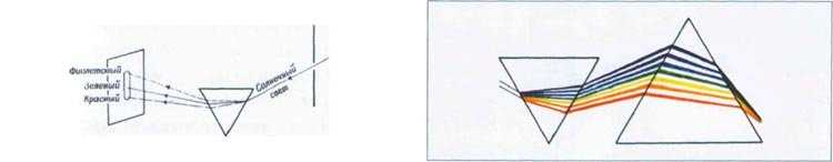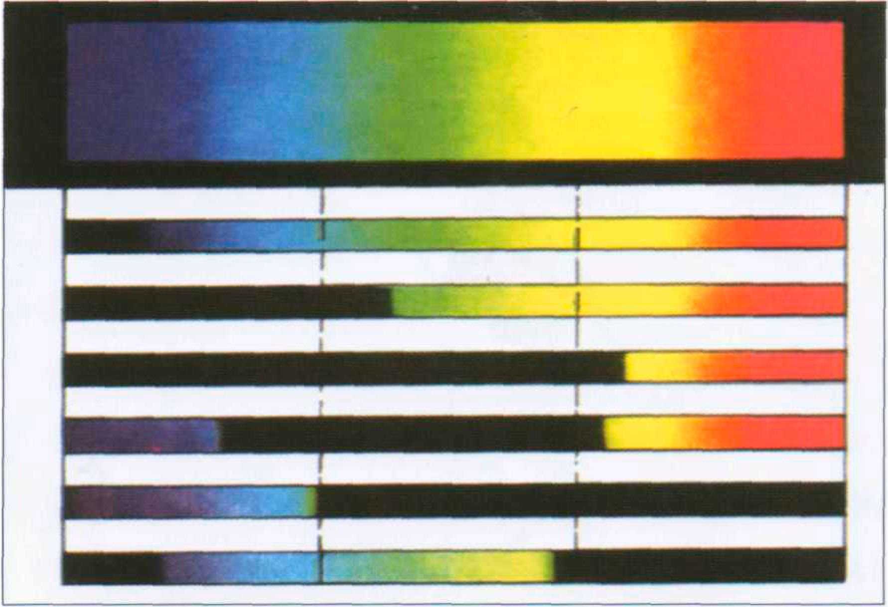 Для получения цвета субтрактивным методом (вычитания) пропускают белый свет через цветное стекло или цветовую желатиновую пленку, содержащую определенные красители. Последние обладают свойством избирательно поглощать отдельные цвета (рис. 15 6). Если три цветных фильтра будут поглощать из белого света главным образом синий, зеленый или красный свет, то эти фильтры покажутся соответственно желтым, пурпурным и голубым (сине-зеленым). Если накладывать желтый и пурпурный фильтры, они будут поглощать синий и зеленый свет, пропуская, только красный. Более распространенный метод «изъятия» ненужных цветов из белого состоит в использовании пигментов, которые избирательно отражают свет. Если поверхность отражает зеленые лучи, она производит впечатление зелёной. Поглощение всех цветных лучей предметом придаёт ему чёрный цвет. Отражение всех лучей формирует белый цвет (рис. 16).