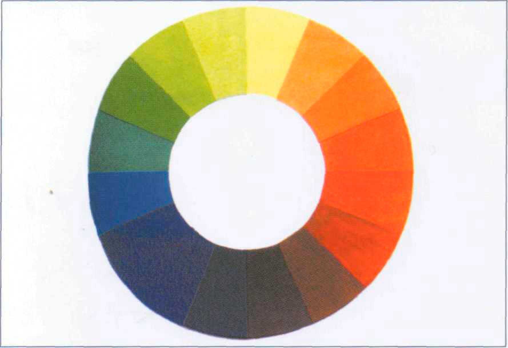 Цвета спектра на цветовом круге располагаются против часовой стрелки (к, о, ж, з, г, с, ф). Последовательность тонов в любом цветовом круге одинакова, количество — не более — 160 (предел различения глазом). Цветовой круг позволяет определить пары противоположных цветов, которые отличаются предельной контрастностью хроматических сочетаний. Такие пары называются контрастными цветами, или дополнительными, — это желтый и фиолетовый, синий и оранжевый, красный и зеленый. Для построения современных цветовых систем служат первичные (основные) цвета. Согласно международной конвенции выбраны чистые цвета с длиной волн 700 нм (красный), 546 нм (зеленый), 435 нм (сине-голубой). При смешивании двух основных цветов можно получить нужные оттенки производного цвета. Они носят название вторичных (составных). Основные цвета нельзя получить путем смешивания (рис. 14).