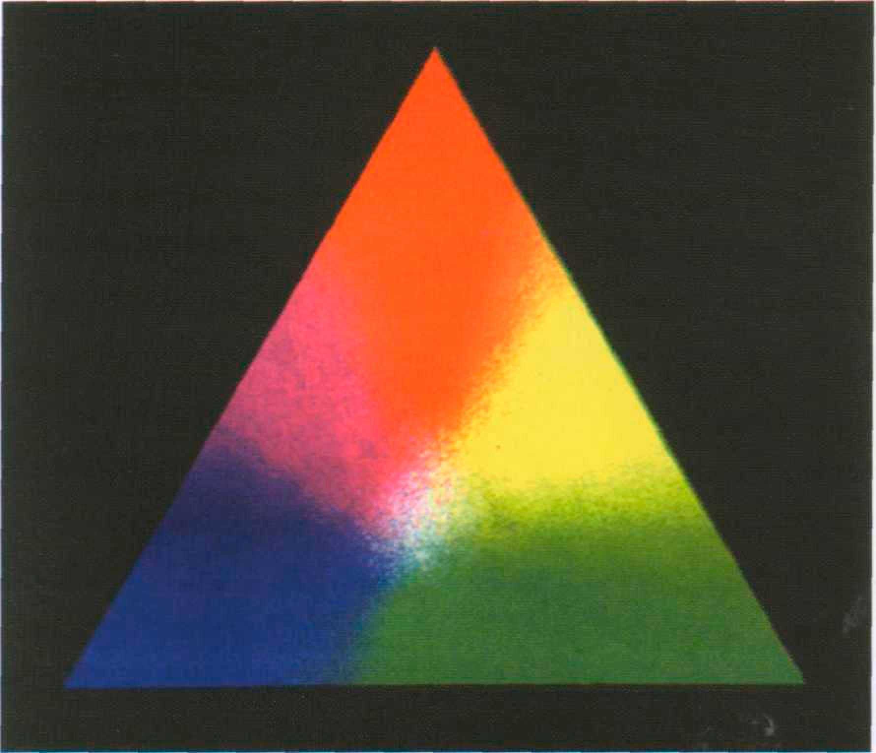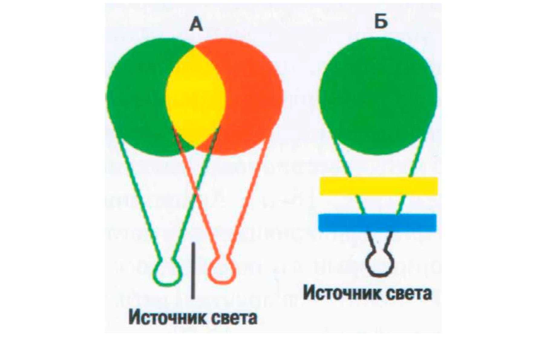 Способы получения света различных цветов. Один из них состоит в выборе соответствующего источника, который испускает свет только одной длины волны. Такими источниками обычно являются электрические разрядные лампы. Примером источника монохроматического света является лазер. Аддитивный метод (сложения) заключается в проецировании лучей разного цвета на темный экран с наслоением их один на другой. Смешение лучей с разной длиной волны дадут цвет, неотличимый от монохроматичного (рис. 15 а).