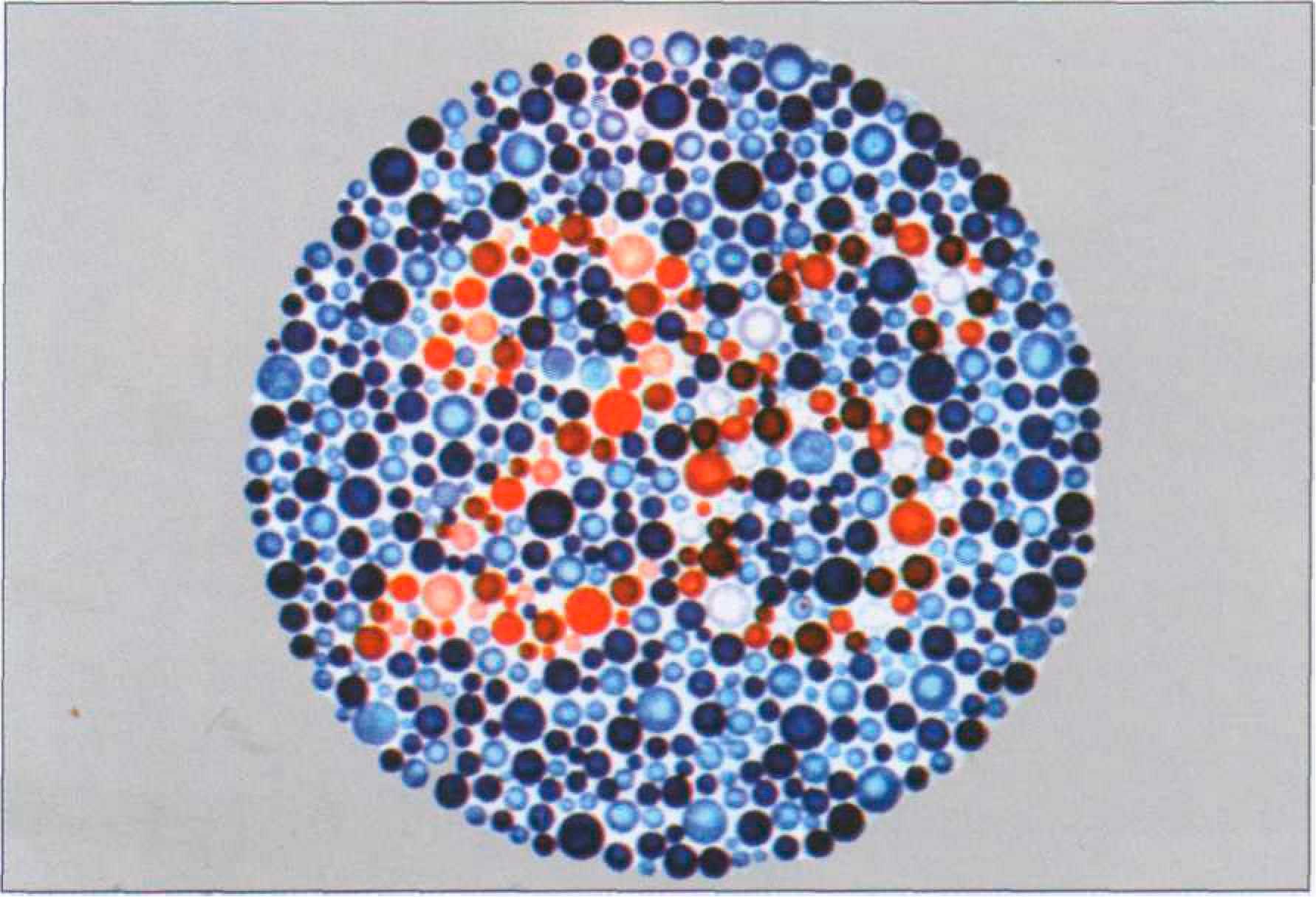 НАРУШЕНИЯ ВОСПРИЯТИЯ ЦВЕТА Частичная цветовая слепота встречается приблизительно у 7-8% мужчин и у 1 % женщин. Причем, нарушения цветового зрения могут проходить на уровне образования зрительных пигментов, обработки сигналов в фоторецепторах или высших отделах зрительной системы, а также в диоптрическом аппарате глаза. Чаще встречаются аномалии зрения, затрудняющие различение некоторых цветов. Возможные типы аномалий представлены следующим образом: 1. Отсутствуют пигменты всех трех типов колбочек или же колбочки не передают информацию на последующие уровни; в результате сохраняется только палочковое зрение (палочковый монохромат). 2. Нарушена функция двух типов колбочек, так что в зрении участвуют колбочки только одного типа (колбочковый монохромат). 3. Нарушена функция колбочек только одного типа (колбочковый дихромат). 4. Неправильно функционирует система красный — зеленый (К — 3), что не нарушает работы цветоразличительного канала синий — желтый (С — Ж) и канала яркости. 5. Другие дефекты могут вызываться нарушениями в нейроне С — Ж. Такие глазные болезни, как глаукома, повышенное внутриглазное давление и особенно заболевания, связанные с поражением макулярного или центрального зрения, сопровождаются и дефектами цветового зрения; обычно при этом ухудшается различение красного и зеленого или синего и желтого цветов. Взрослые люди часто даже не подозревают о существовании у них врожденных аномалий цветового зрения, пока они не будут выявлены с помощью лабораторных тестов (рис. 44).