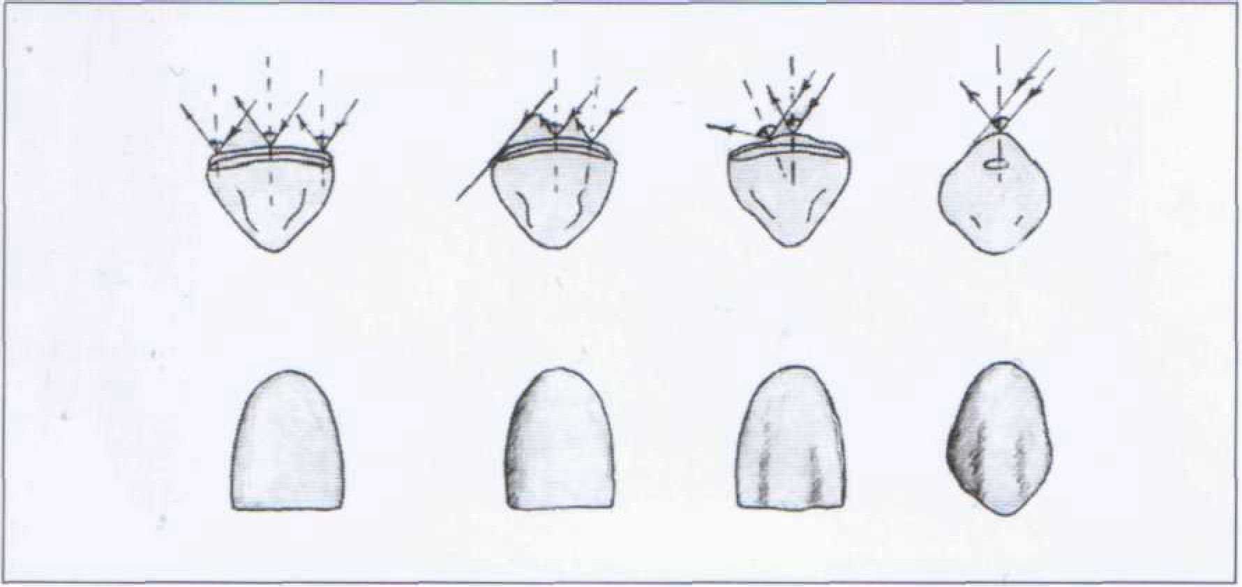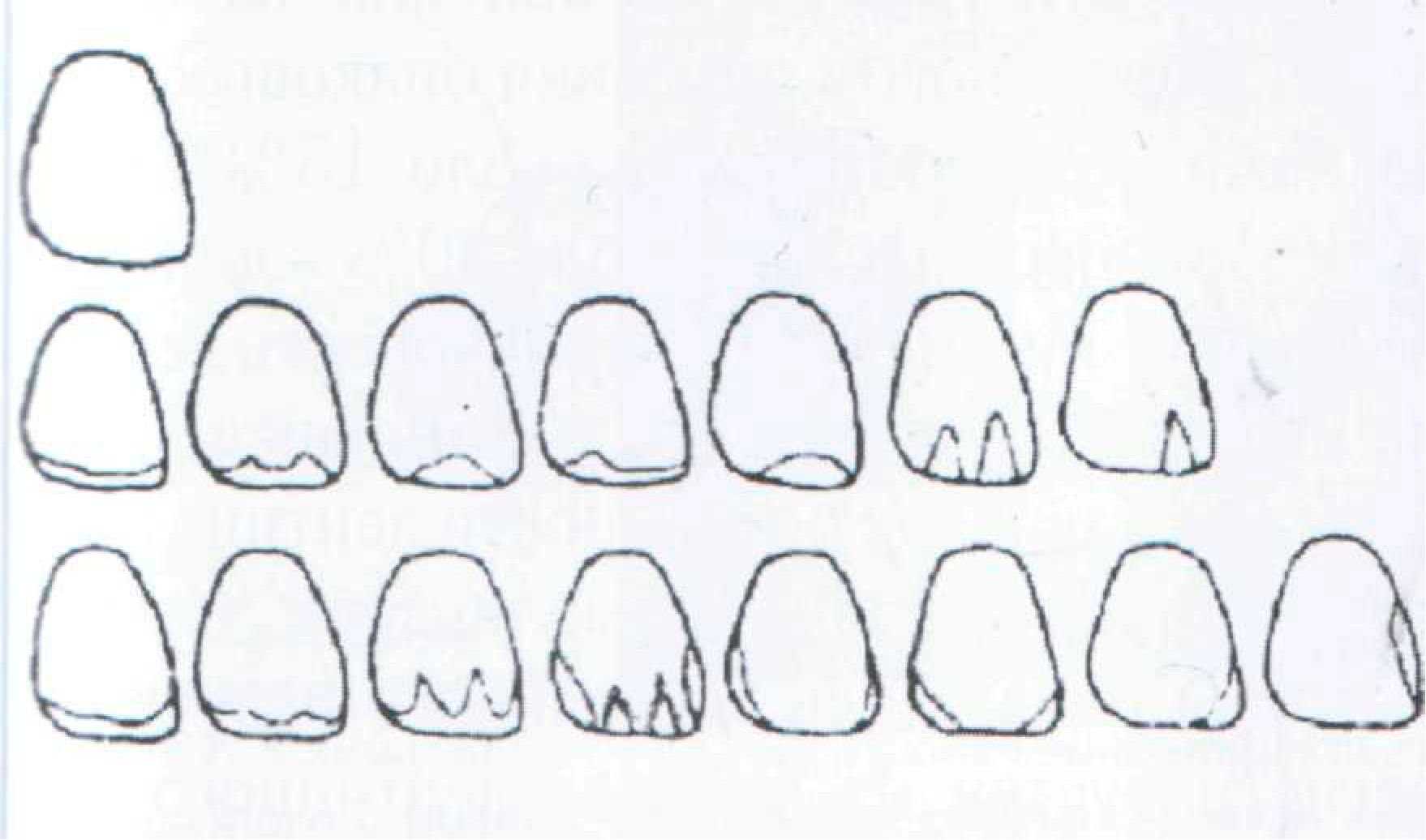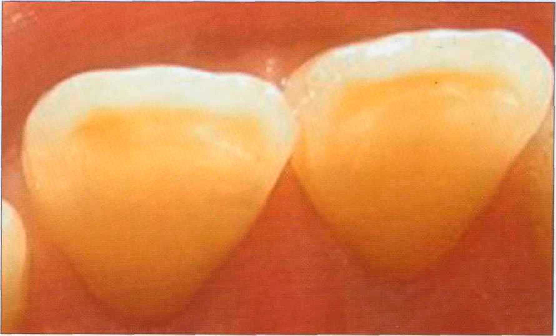 Существенное влияние на светопроводимость оказывает толщина слоя эмали. Коэффициент диффузного пропускания света Т, изученный на шлифах эмали толщиной 1мм колеблется от 3 до 18%, причем незрелая эмаль пропускает больше света, чем зрелая. Так, в зависимости от длины волны Т составляет 10-18% для эмали молодого зуба и от 3 до 10% для минерализованного. Присущее эмали свойство светопроницаемости позволяет лучам, избирательно отражающимся от пигментов дентина и эмалево-дентинного соединения, проходить через эмаль и восприниматься глазом, как цвет зуба. На отдельных участках зуба эмаль не имеет подлежащего дентина и воспринимается как прозрачная. Речь идет о режущем крае и проксимальных поверхностях. Различают несколько типов прозрачности (рис. 62).