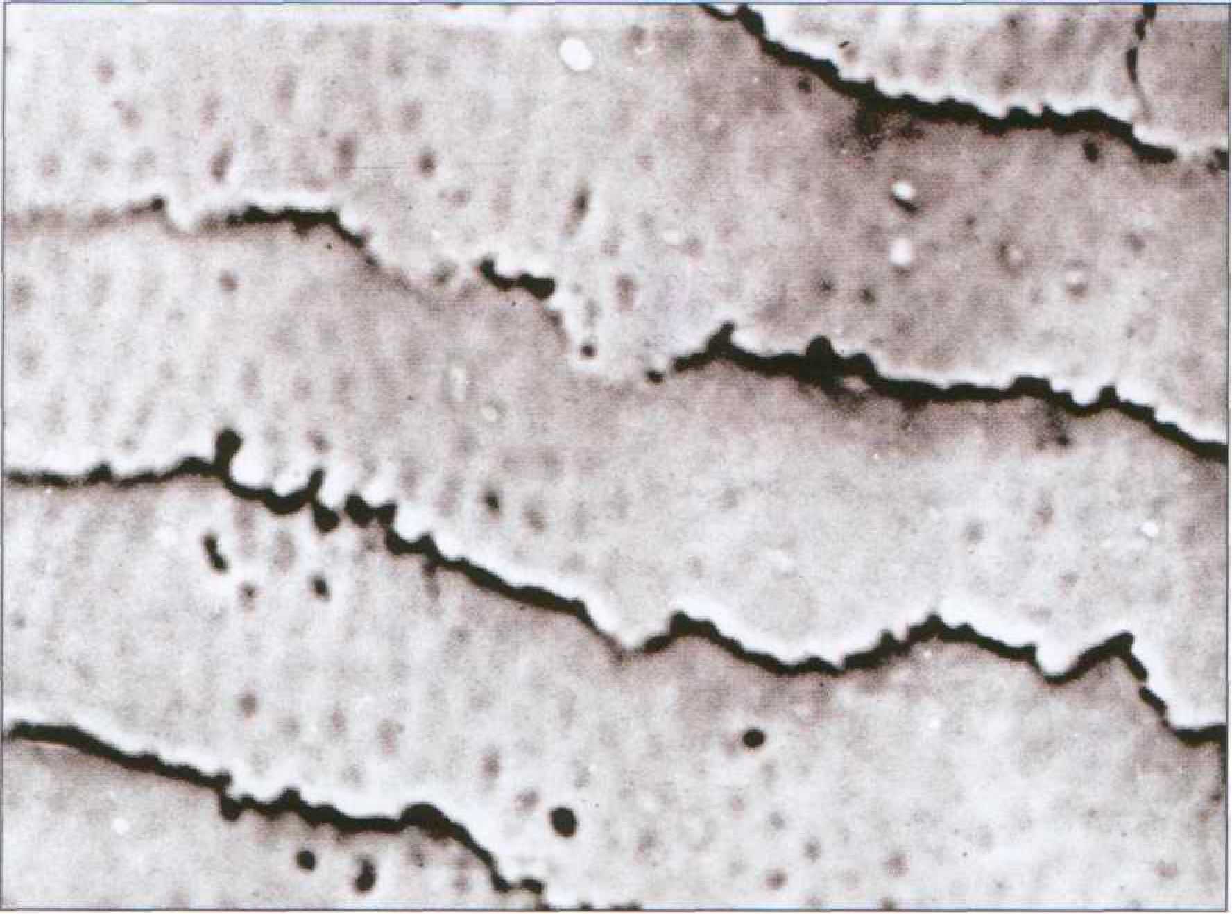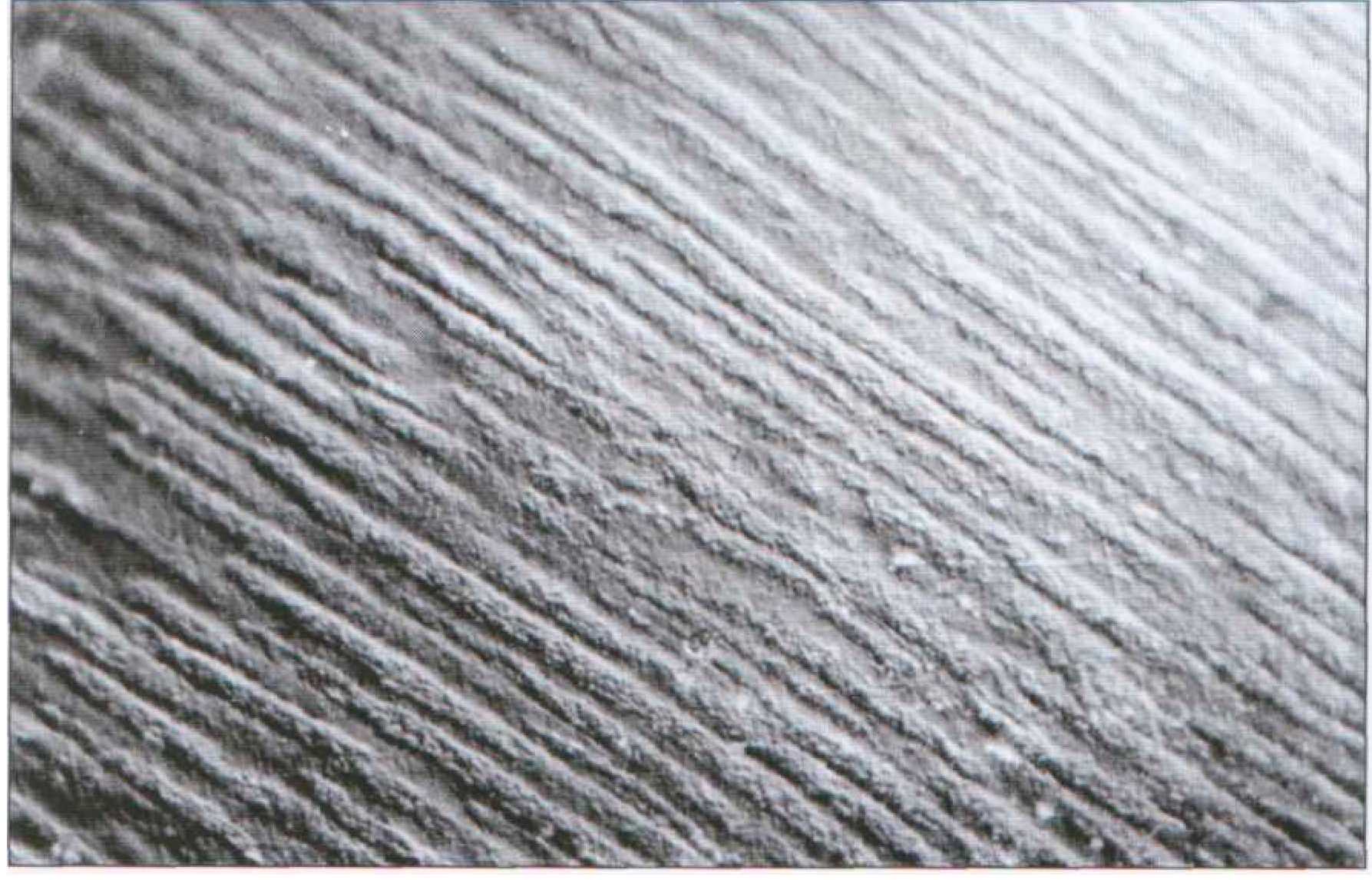 Высокое содержание минеральных компонентов, представленных плотно упакованными кристаллами в эмалевыхлризмах, которые, в свою очередь, тесно прилежат друг к другу, обеспечивает гомогенность структуры (рис. 63). В результате лучи света, проникая через эмаль, придают светопроводимость, а отражаясь от поверхности — своеобразный блеск. Внешнее рассеивание света, усиливающее белизну и матовость, связано с микрорельефом поверхности и органическими покровами зуба. |