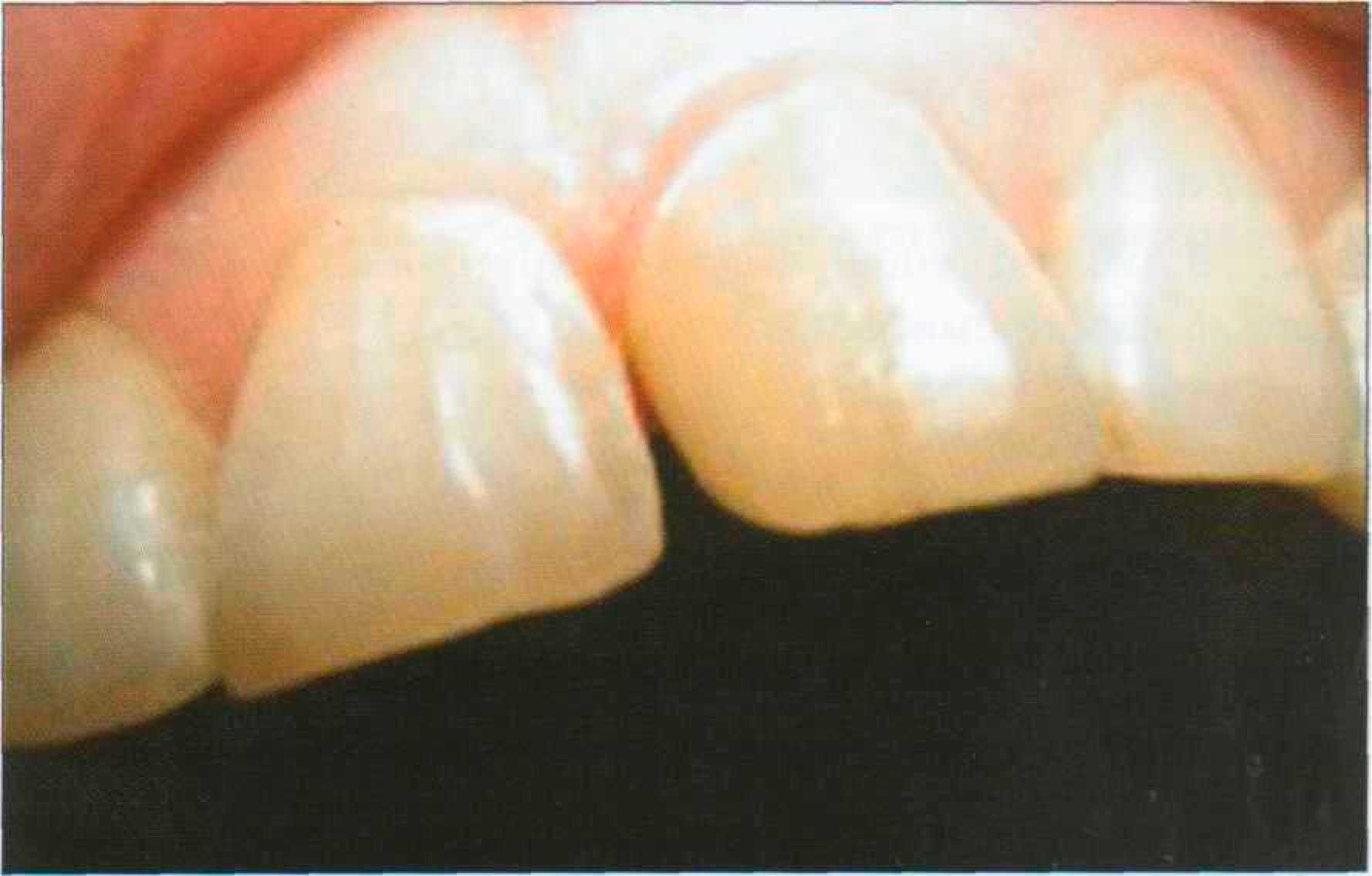 Прихотливое мерцание образцов опала объясняют его строением. Глобулы кремнезема размерами 150-400нм — плотноупакованные сферолиты. Промежутки между ними заполнены мелкими частицами и водой. Проникающий в камень свет рассеивается, отражаясь поверхностью пор, и камень «играет». Так, гидрофан («водяной» опал) в сухом виде молочно-белый, мутный, в воде становится прозрачным. По аналогии с драгоценными камнями (опалами), содержащими 10% воды, можно предположить, что свойство эмали опалесцировать зависит от микропор и зубного ликвора. Высушивание приводит к потере этого качества. Голубые оттенки зуба могут также объясняться свойствами эмали: рассеивание коротких волн создает сине-голубой цвет. Обладая способностью диффузного отражения и рассеивания света, эмаль, кроме того, характеризуется свойством пропускать световые лучи. Это явление носит название трансмиссии. Проникая в эмаль и проходя сквозь кристалл, луч света замедляет скорость и рас- щепляется на два пучка, каждый из которых имеет свой угол преломления. Показатель преломления является одной из характеристик кристалла; в частности, для апатита (основной структурной единицы эмали зуба) он составляет 1,63-1,64. Для сравнения: обычное стекло (полностью прозрачное) имеет коэффициент преломления близкий к 1,5. В практике стоматолога преломление света при прохождении границы пломба-зуб может привести к тому, что эта граница станет заметной для глаза, если не выполняется скос эмали, и в результате имеется резкий переход от зуба к конструкции (рис. 60).