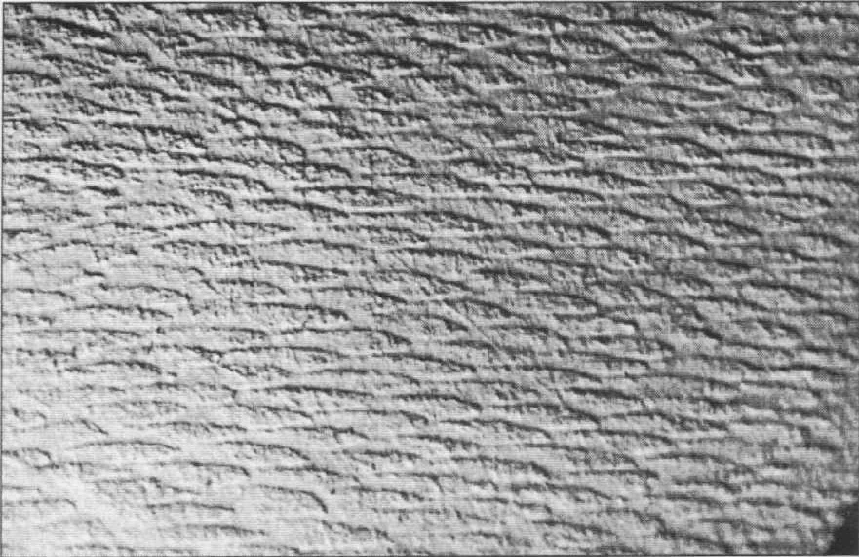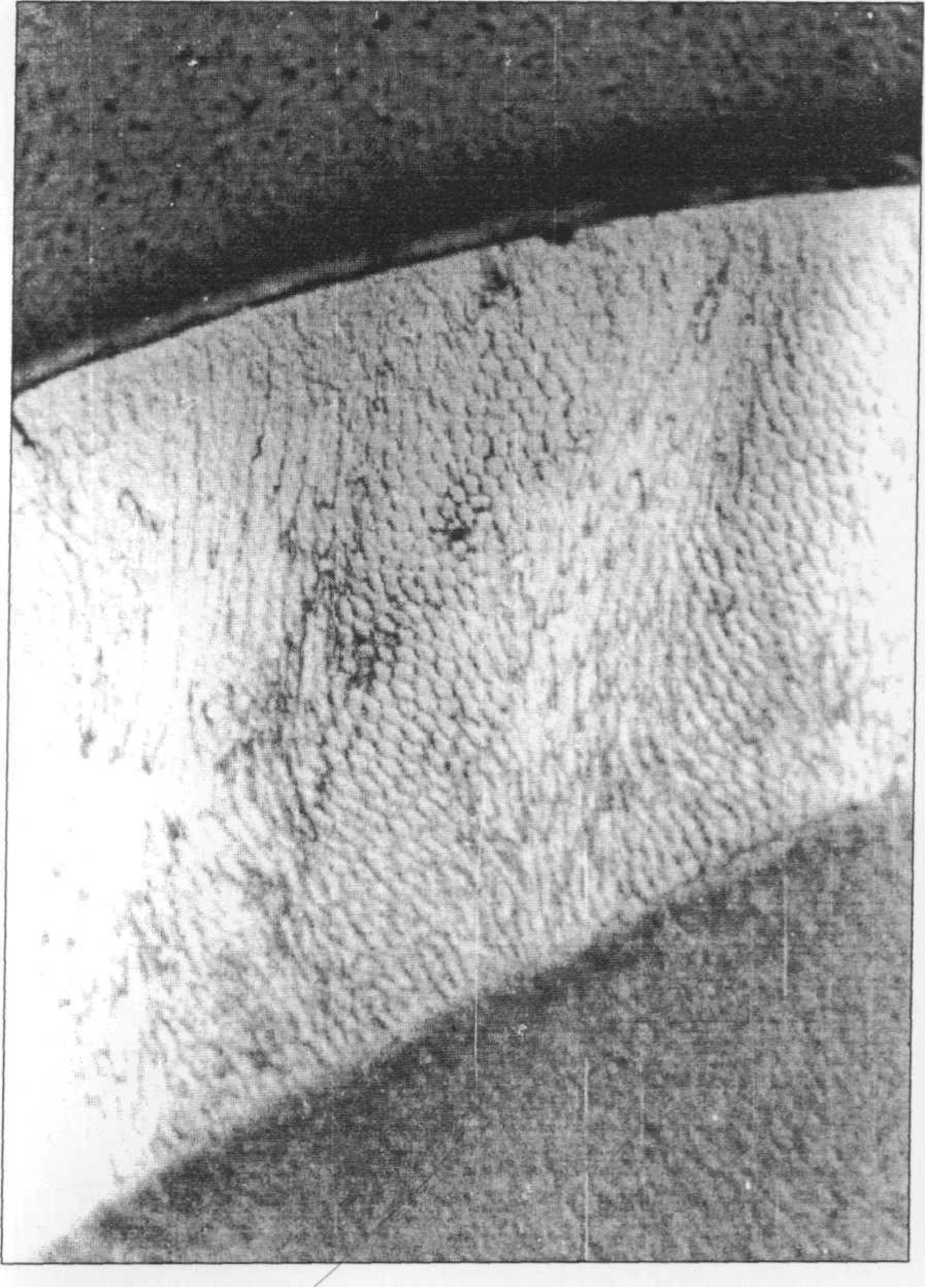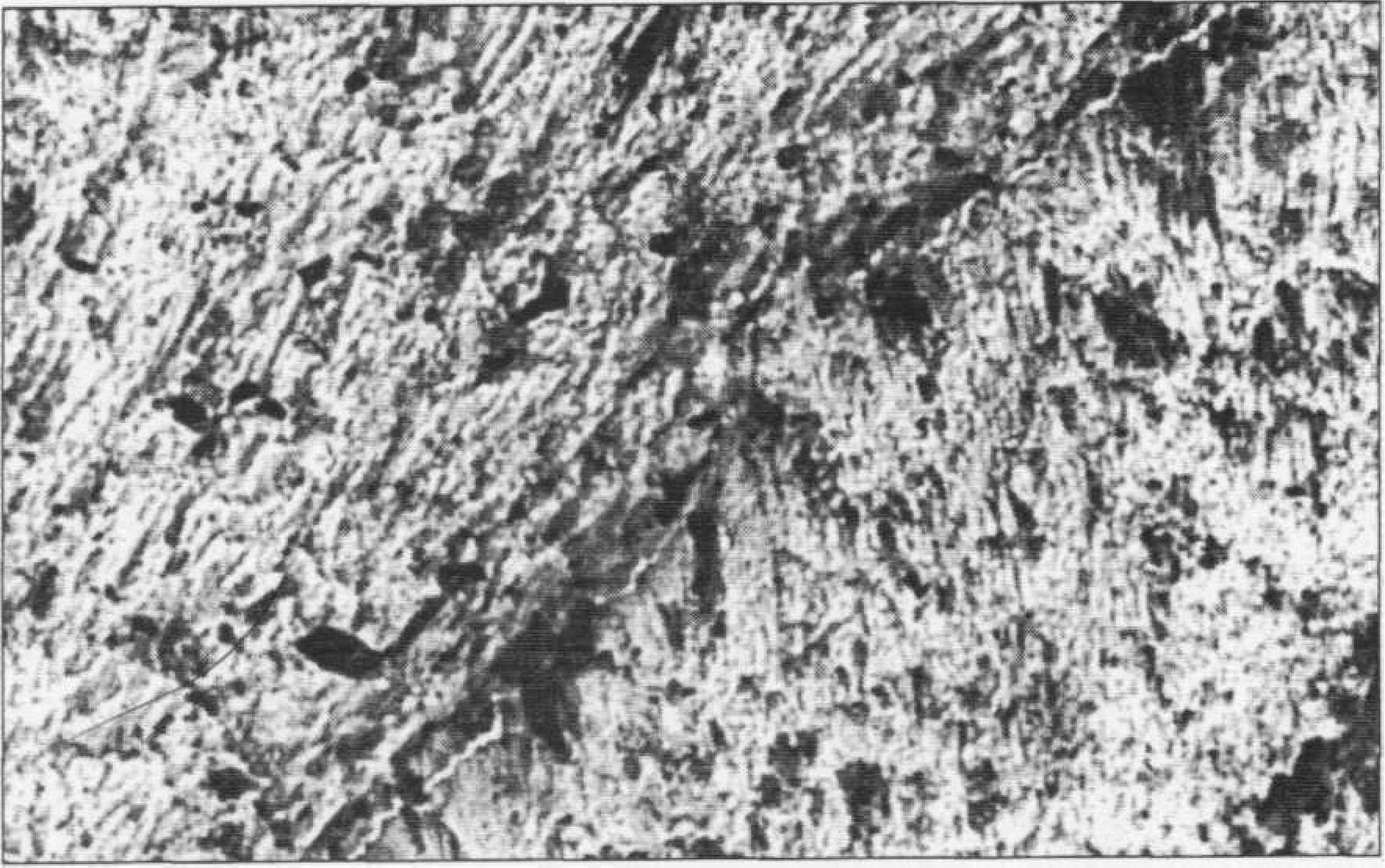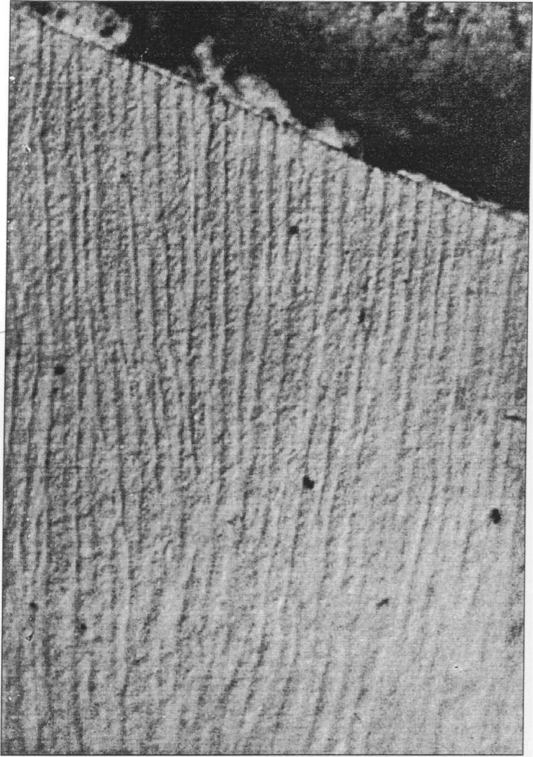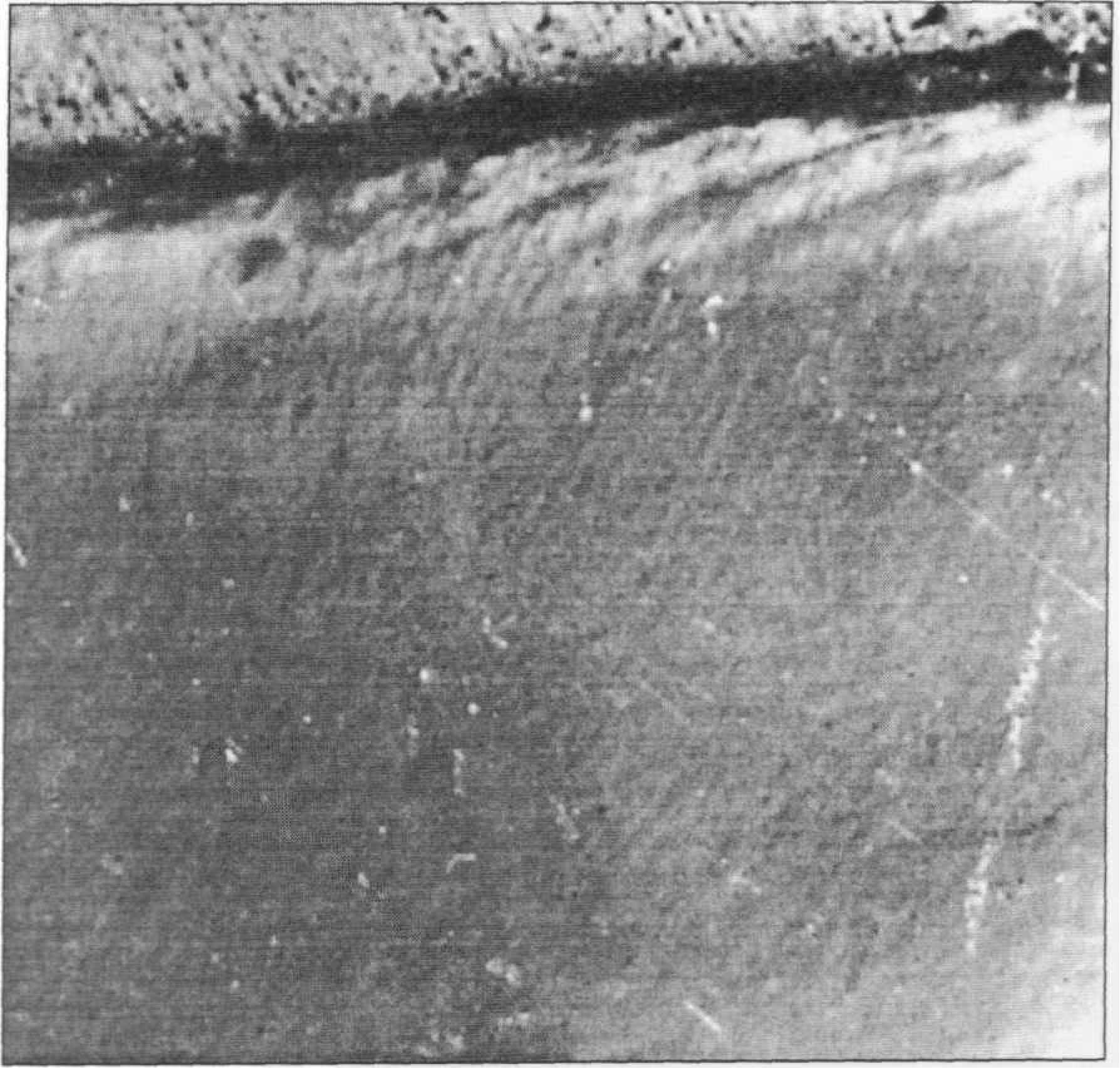 Некоторые из них дают двойное лучепреломление, указывая на более высокую минерализованность, другие — псевдоизотропны (низко минерализованы). Особый вид — неонатальная линия на молочных зубах и первых постоянных молярах — указывает на переход от интра- к экстранатальному периоду. Плотность кристаллов в этой зоне снижена. Линии Ретциуса отчетливо определяются, отличаясь по своим оптическим свойствам. Множественные поры снижают отражательную способность данных участков эмали. Независимо от возрастной принадлежности картину, характерную для эмали детских зубов, имеют полуретинированные зубы. На шлифах отчетливо видны линии Ретциуса. Их образуют микропоры, сливающиеся в одну цепь и открывающиеся на поверхности зуба. В результате поверхность имеет фестончатый вид (рис. 95). Призмы, пересекаемые линиями Ретциуса, фрагментированы, их очертания нечеткие. В ряде случаев группы призм поверхностного слоя эмали подвержены деструкции. Полосы Гунтера-Шрегера, заметные в отраженном свете, оказываются не всегда упорядоченными, что можно объяснить незавершенной минерализацией. Органическое вещество в эмали встречается в виде скоплений (около 2% эмали по весу). Эмалевые пластинки проходят через всю толщину эмали, их больше в области шейки. Они сохраняются и после декальцинации эмали. Эмалевые пучки (ламелы) располагаются у эмалево-дентинного соединения. Эмалевые веретена встречаются в центральных отделах. Описанную некоторыми авторами органическую оболочку призм обнаружить в зрелой эмали не удается.