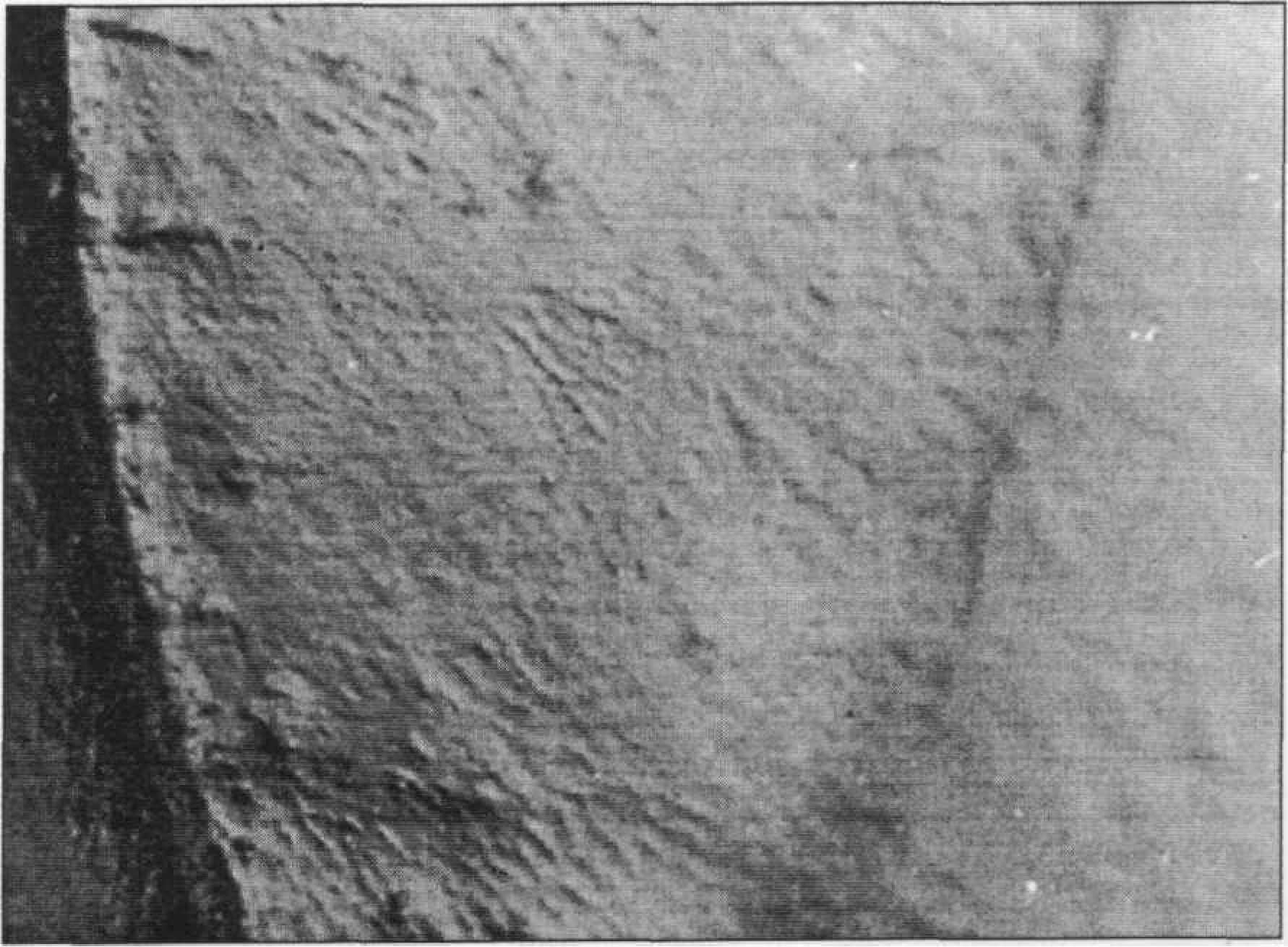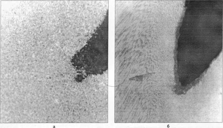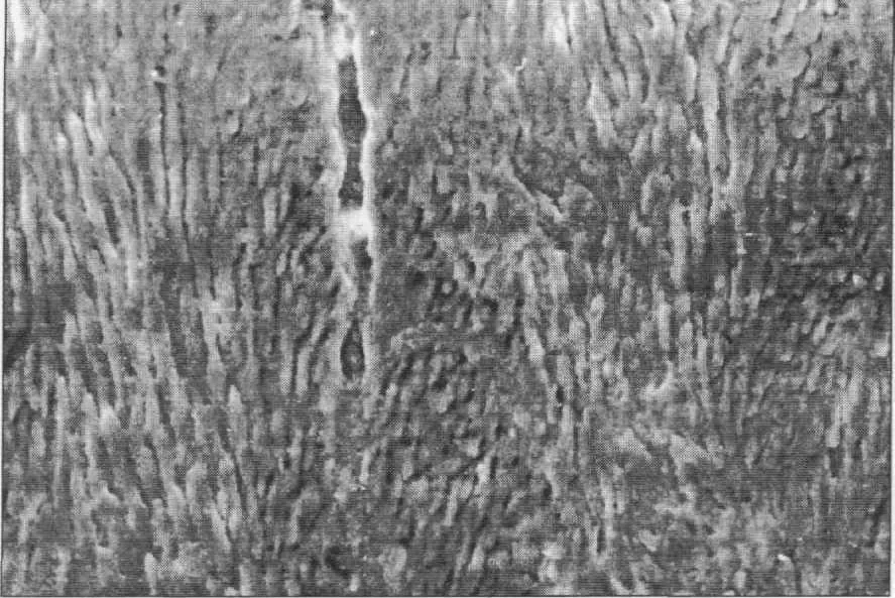 Полосы и царапины идут на зубе в различных направлениях. Мелки трещины огибают головки призм, крупные чаще располагаются на вестибулярной поверхности параллельно вертикальной оси зуба. Как правило, они заполнены гравиеподрбными отложениями, аморфным веществом. В поверхностном слое эмали образуются трещины, микродефекты, п`ризмы слабо конту- рируют (рис. 106).