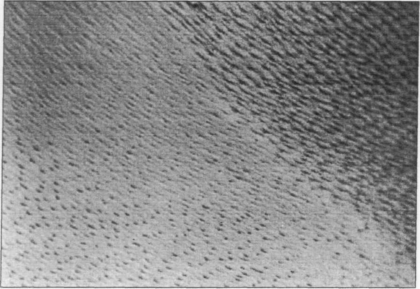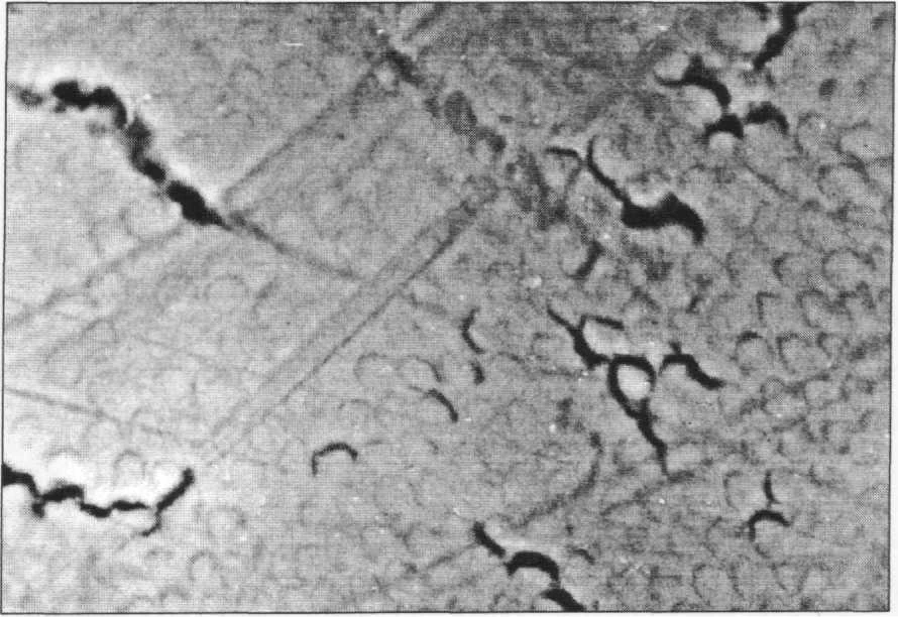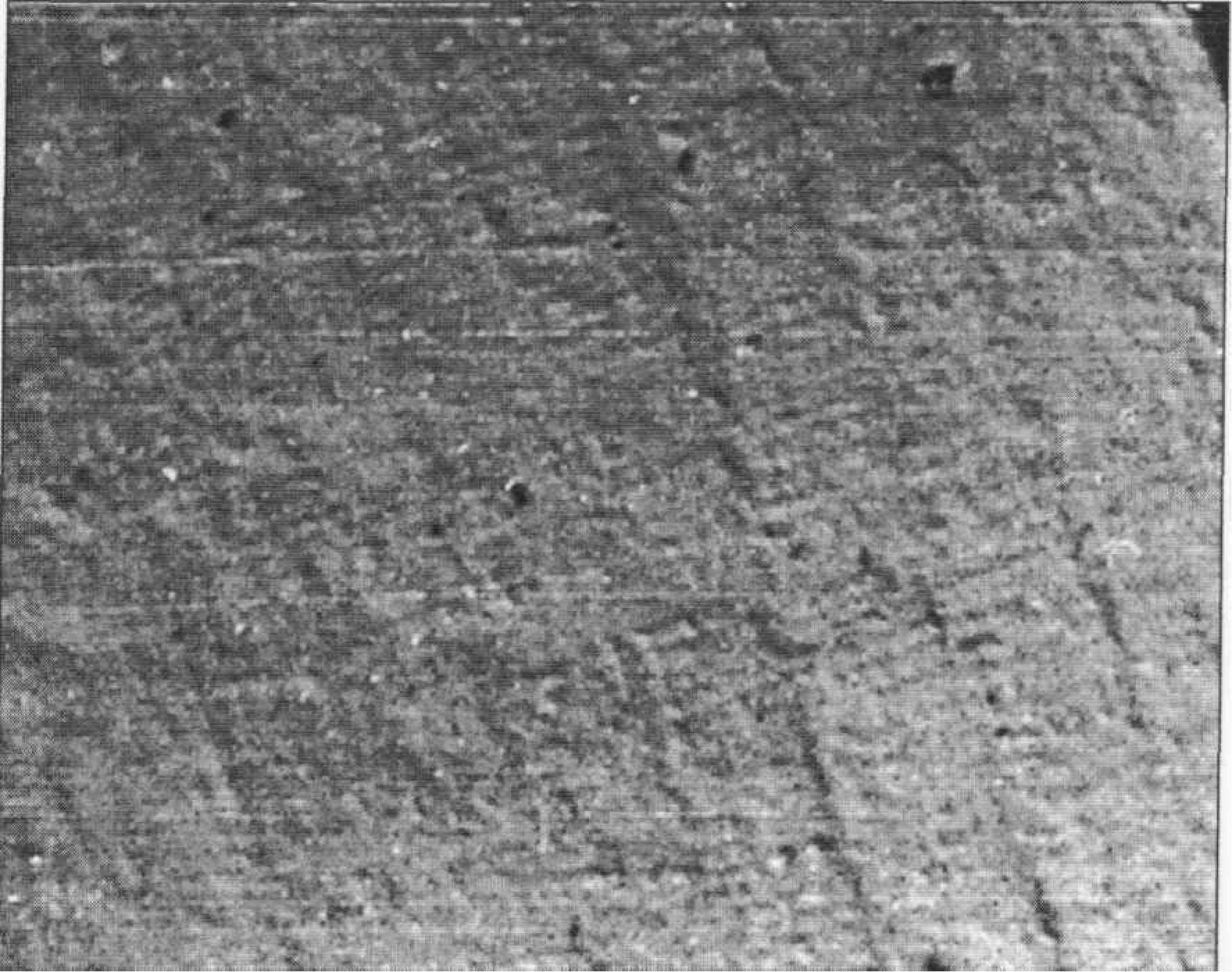 Это касается эмали, располагающейся под зубным камнем. В пришеечной области об и наруживается усиление линии Ретциуса и шлиф зуба. Более четкий рисунок призм на этом участке свидетельствует о пониженной минерализации, а, следовательно, о появлении или сохранении зон, отличающихся пористостью. Кроме описанных возрастных особенностей, специфические преобразования происходят в области фиссур премоляров и моляров. Нередко наблюдается их спонтанное запечатывание естественным путем. В таких случаях в фиссурах обнаруживаются плотные высокоминерализованные образования. В группе старшего возрастного периода (45-70 лет) отмечается дальнейшее повышение однородности эмали зубов с сохранением призменной структуры во всех слоях, кроме поверхностного, где на большей части она беспризменная. Полосы Гунтера-Шрегера контрастны, линии Ретциуса, напротив, выделяются слабо. Уменьшение объема органического компонента эмали, размеров микропространств приводит к снижению количества воды в твердых тканях зуба. Отмечается уплотнение кристаллической решетки — за счет замещения ионов ОН на F. Поверхностный слой эмали зрелых и «старых зубов», как правило, становится беспризменным на десятки мкм. Зубы отличаются значительной стертостью бугров и режущего края. Площадь стертости с возрастом увеличивается. В сканирующем электронном микроскопе видны отдельные призменные участки поверхности эмали, маскирующиеся пелликулой, причем головки призм выступают над ее уровнем. На поверхности интактной эмали выявляется значительное число царапин, борозд, трещин (рис. 105).