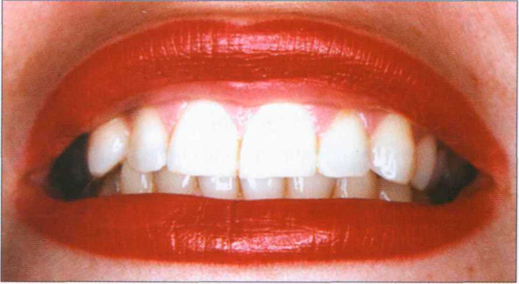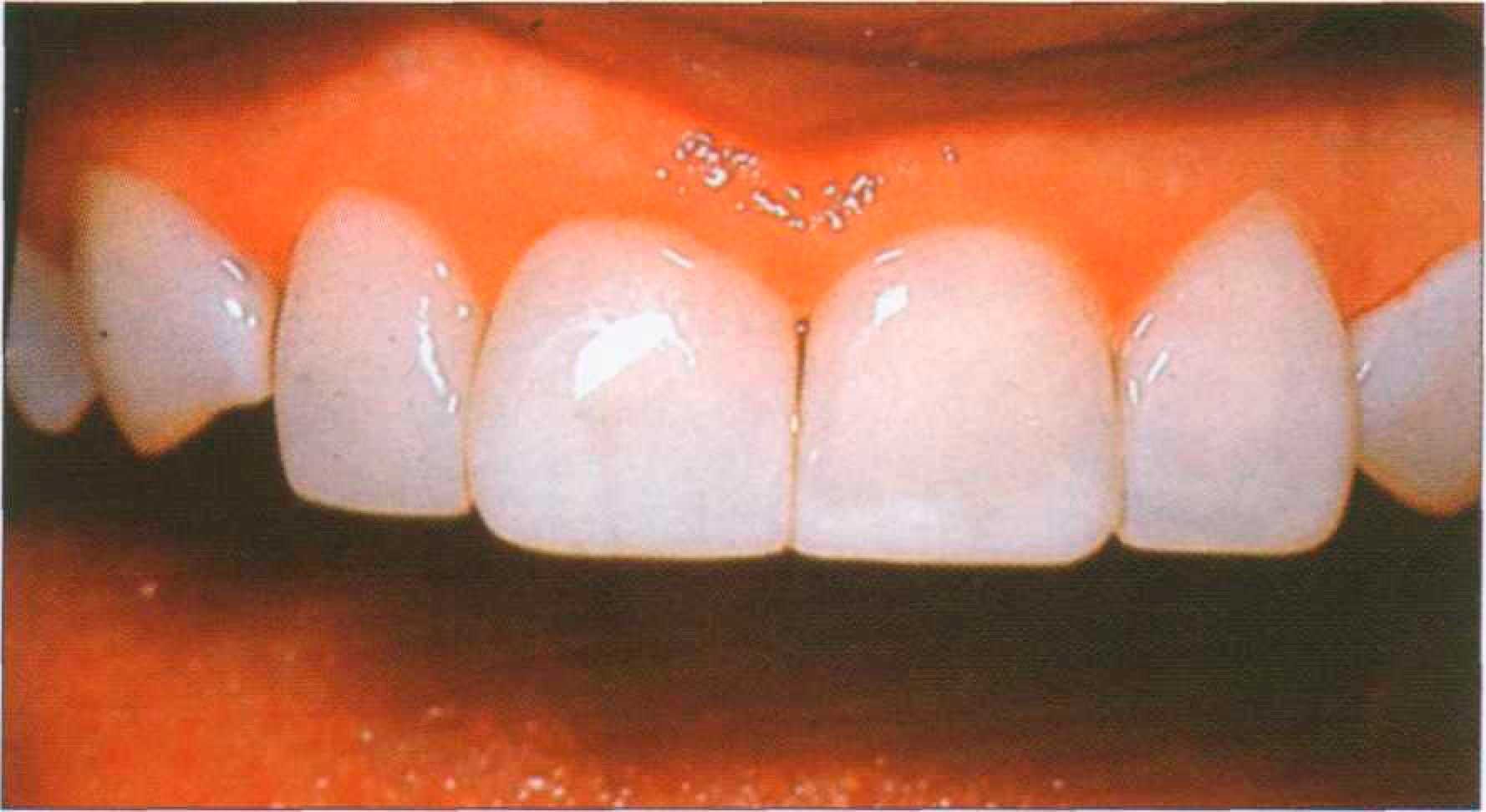 РОЛЬ ФОНА Важнейшим свойством, порождающим и объясняющим наиболее частые ошибки при визуальной оценке цвета зуба, является контраст ощущений, когда интенсивность и качество зрительных восприятий изменяется под влиянием сопутствующего или предшествующего раздражителя. Поэтому, существенную роль в визуальном определении цвета играет фон. Если зуб находится рядом с цветными объектами, то отраженные от них лучи формируют на поверхности эмали рефлекс («окрашенную» тень). Так, воспаление слизистой оболочки десны придаст розовые оттенки эмали (рис. 115).