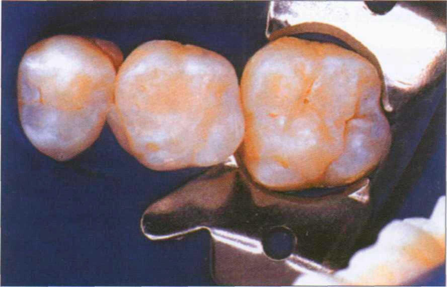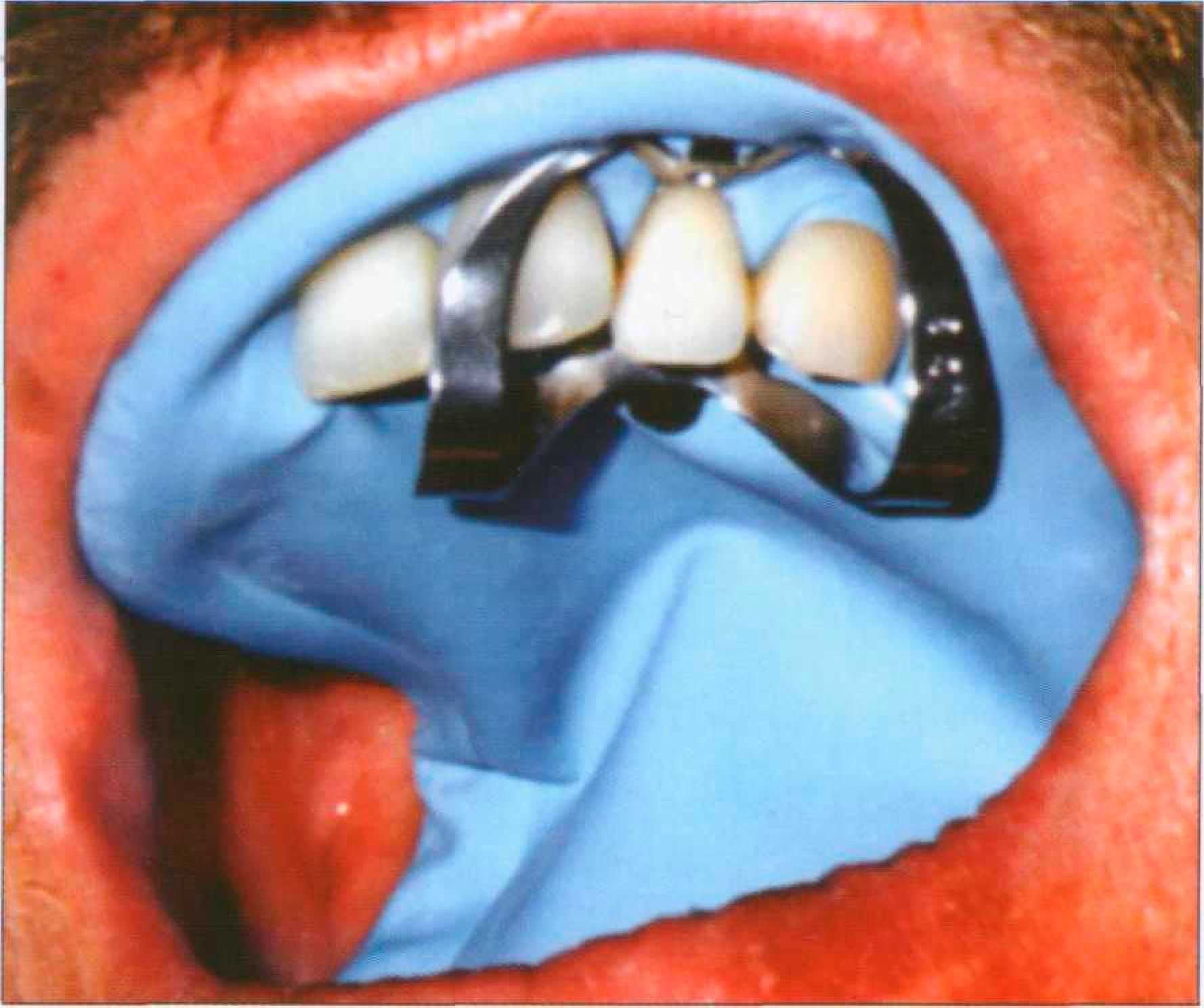 Подобный эффект может вызвать губная помада. Используемый коффердам формирует голубые или зеленые тени, обусловливая соответствующие оттенки отдельных участков зуба (рис. 116). |