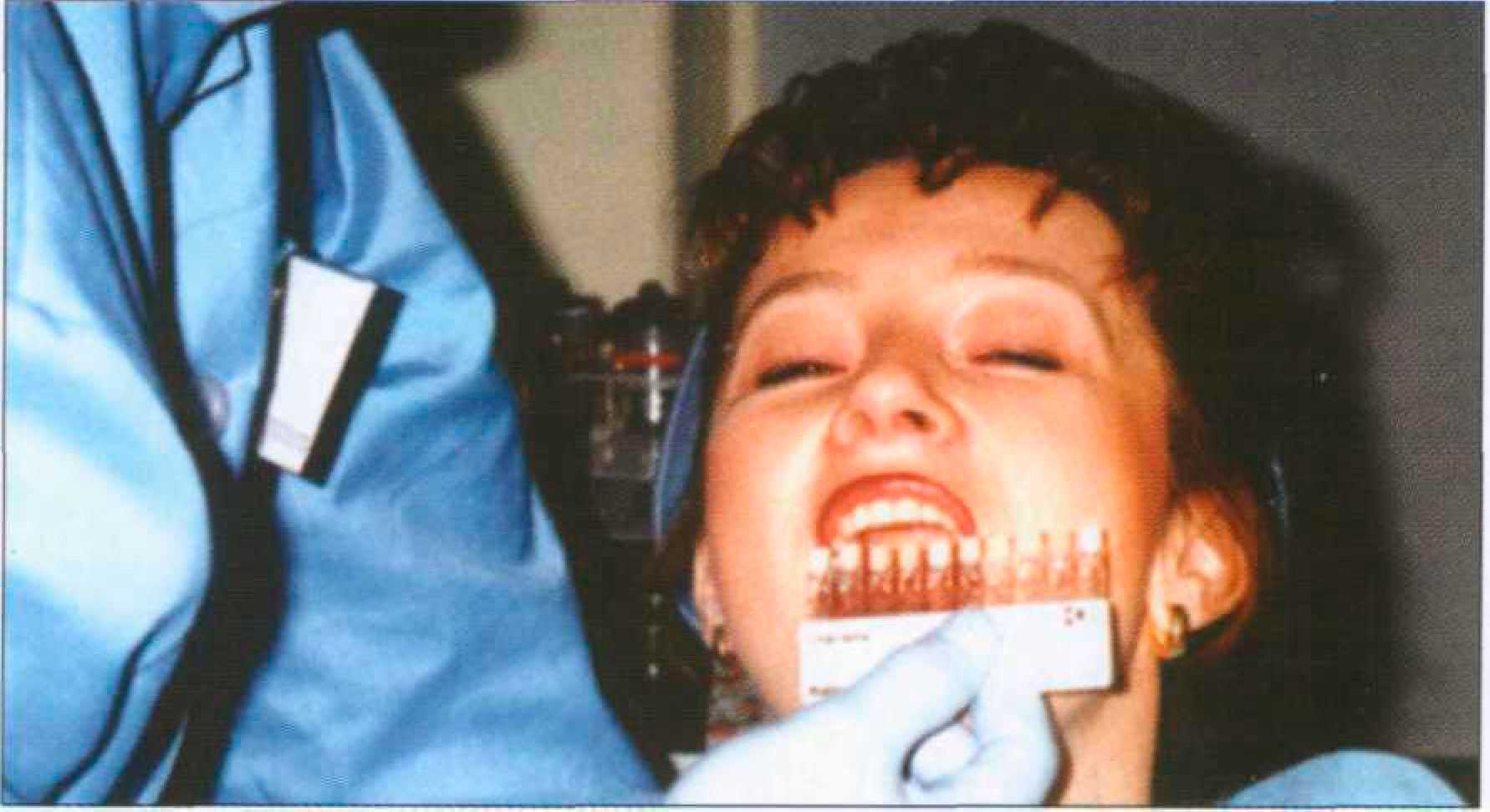 Восприятие тонких цветовых различий (нюансов цвета) может быть нарушено при неумении выделения фона и объекта. В качестве примера можно привести выбор стоматологом оттенков цвета отдельного зуба на фоне зубного ряда, лица пациента, одежды, стен кабинета. Некоторые врачи выбирают основной цвет, учитывая только оттенки, соседнего зуба, забывая о симметричных. В таком случае изготовленная конструкция может создавать асимметрию цвета. Определение оттенков зуба становится невозможным после рассматривания лампы накаливания или солнечного зайчика, что объясняется феноменом последовательного контраста. Длительные последовательные образы могут сохраняться до нескольких минут, затрудняя зрительное восприятие тона, светлоты, насыщенности. Если задержать взгляд на цветном фоне, а затем перевести на зубной ряд, то на определение цвета зуба окажет воздействие так называемый отрицательный последовательный образ. К оттенкам зуба будут примешиваться цвета, дополнительные к первичному стимулу. Например, предварительное рассматривание синего фона (одежды медперсонала) усилит восприятие желтоватых тонов в оттенках зуба (рис 119).