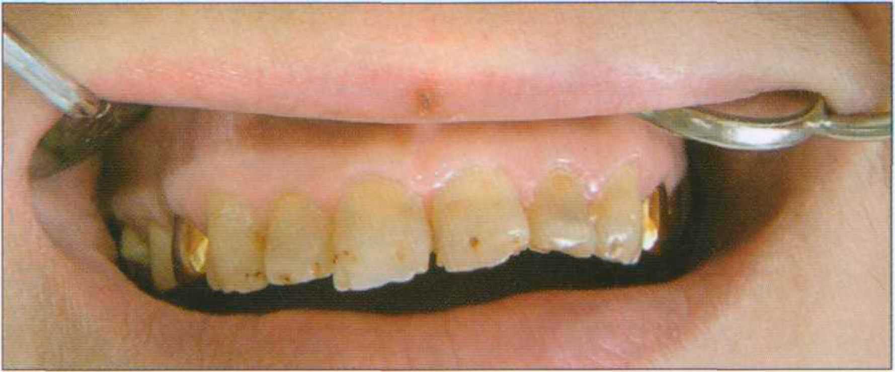 Характерным является поражение иммунных зон. В отличие от кариозных пятен при гипоплазии поверхность эмали сохраняется блестящей. Тетрациклиновые пятна — обычно проявляются в виде глубокой желтой (лимонно-желтой) или коричнево-желтой, коричнево-оранжевой, серо-коричневой окраски, являющейся результатом лечения тетрациклином детских инфекций. Причиной окрашивания служит связывание тетрациклина с кальцием в процессе минерализации эмалевого матрикса. Период, в который могут сформироваться тетрациклиновые пятна, колеблется от пятого месяца внутриутробной жизни до седьмого года жизни. Тетрациклиновые зубы флюоресцируют в ультрафиолетовом свете, что позволяет проводить дифференциальную диагностику с другими видами пигментации. Кроме того, для тетрациклиновой окраски характерна локализация в виде ленты вокруг зуба с наиболее темным пятном в пришеечной области. Флюороз. Изменение цвета зубов эндогенным путем происходит также при повышенном содержании фтора в воде, вызывающем эндемический флюороз. Чем выше по отношению к оптимальному (lppm) количество фтора, тем более выражено повреждение минерализованных тканей. Иногда все зубы бывают матово-белыми до одного уровня. Изредка встречаются полностью молочно-белые зубы — «фарфоровые». При детальном осмотре можно обнаружить микроволнистость эмали. Флюорозом могут поражаться все зубы, либо группы зубов, формирующихся в один период времени. Поверхность эмали сохраняется блестящей в отличие от кариеса. При высушивании зуба струей воздуха матовость эмали не усиливается. Интенсивность окраски зубов может увеличиваться, что связано с прижизненной их пигментацией. В клинике в зависимости от степени выраженности процесса различают легкую, среднюю, и тяжелую форму флюороза. |
