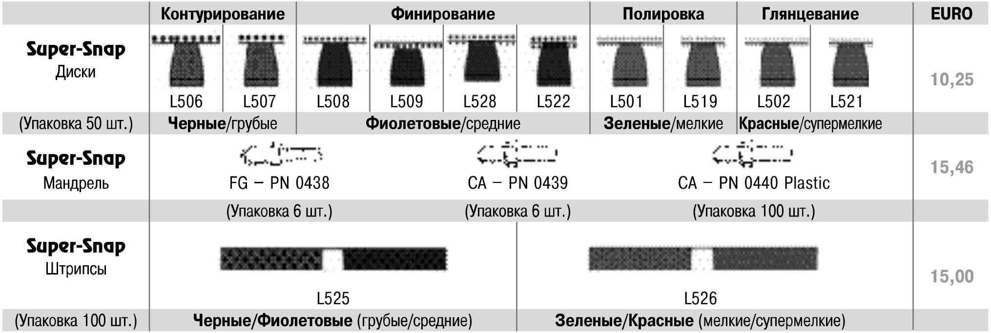 Используя полировочные штрипсы, возможно получить отличные результаты при обработке интердентальных зон. Цветовая маркировка и зернистость соответствуют покрытию дисков Super-Snap:.