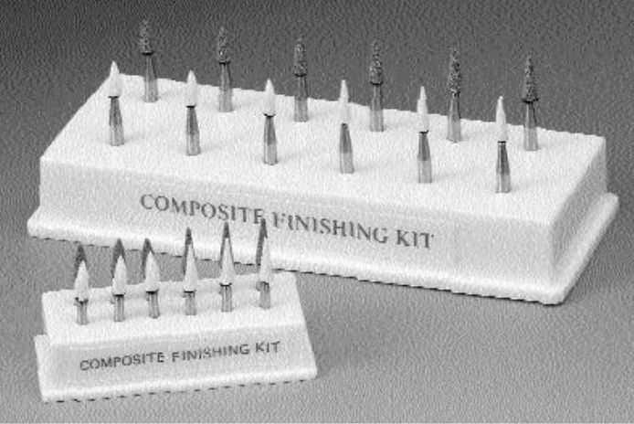 Комплект инструментов для финирования и полировки композитов. Камни Dura-Green для грубой обработки и удаления излишков, камни Dura-White для финирования, инструменты Composite для предварительной полировки, полиры Composite Fine для глянцевания без повреждения эмали.