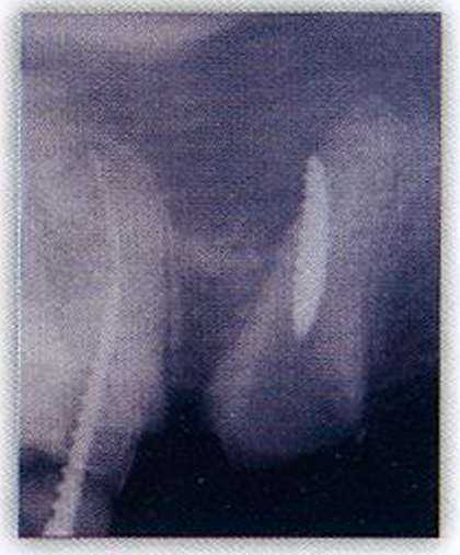 | Рис. 2. Рентгенограмма. Перфорация боковой стенки корня зуба 25 анкерным штифтом |