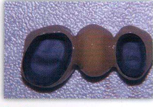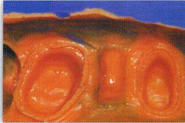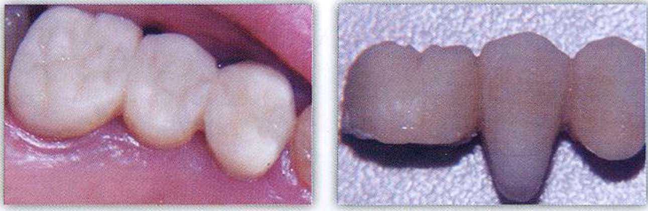 Промежуточная часть мостовидного протеза постоянной конструкции должна моделироваться на модели с десневой маской. Важно, чтобы десневая часть промежуточной части протеза (ovate pontic) была хорошо отполирована (рис. 10). Во время погружения в ложе промежуточная часть мостовидного протеза должна слегка раздвигать десну. Возникающее при этом побледнение десны должно проходить через несколько минут. Если этого не происходит, следует убрать излишки керамики. В тех случаях, когда зуб был удален давно, ложе может быть сформировано с помощью пластики десны. При значительной атрофии кости может понадобиться костная пластика. Дизайн десневой поверхности промежуточной единицы мостовидного протеза в этих случаях немного отличается от вышеприведенного.