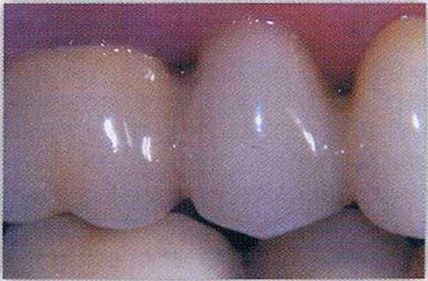 | Рис. 11-13. Отличное состояние десны вокруг промежуточной части мостовидного протеза через 1 мес. после фиксации постоянного протеза |