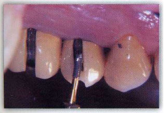 В данной статье представлен клинический пример использования овоидной конструкции промежуточной части мостовидного протеза в боковом отделе зубного ряда. Пациентка П. обратилась в клинику с жалобой на боли при накусывании на боковые зубы верхней челюсти слева (рис. 1). После обследования и проведения всех необходимых диагностических тестов была выявлена причина болей и поставлен диагноз: обострение хронического гранулематозного периодонтита верхнего левого второго премоляра, вызванного перфорацией боковой стенки корня анкерным штифтом (рис. 2). Так как верхний левый первый моляр также нуждался в проведении повторного эндодонтического лечения, было принято решение о снятии старых металлокерамических конструкций с целью проведения необходимого эндодонтического и, возможно, хирургического лечения. Почему удаление причинного зуба ставилось под сомнение? Дело в том, что с появлением инертных цементов стало возможным сохранение зубов с наличием перфораций различных локализаций, что подтверждается большим количеством исследований. Тем не менее возможное удаление причинного зуба определило планирование изготовления провизорного мостовидного протеза с опорой на 26 и 24 зубы. Для выполнения поставленной задачи нам было необходимо разрезать и снять старый мостовидный протез. Разрезание коронок проводилось двумя этапами. На первом этапе алмазным инструментом проводился вертикальный — пропил на всю высоту коронки от шейки до середины окклюзионной поверхности. Необходимость такого пропила заключается в |