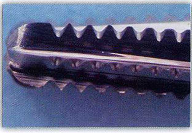 | образовании борозды или будущей «колеи», по которой ровно, без срывов будет двигаться инструмент, осуществляющий распил коронки. Вторым этапом проведено разрезание металлического каркаса мостовидного протеза (рис. 3). Наши предпочтения в проведении этой манипуляции были отданы бору Great White Ultra 856 компании «СС БАЙТ» как наиболее подходящему для решения поставленной задачи благодаря большой длине рабочей поверхности и идеальной центровке (рис. 4). Кроме того, бор GW Ultra 856 изготавливается из цельного блока карбида вольфрама, что многократно усиливает шейку бора и полностью предотвращает коррозию в месте соединения рабочей головки с хвостовиком, исключая возможность отлома головки бора во время работы. Использование этого бора в данной клинической ситуации было предпочтительным перед традиционно используемым бором GW 2 еще и потому, что у бора GW Ultra существенно увеличивается шаг между расположением горизонтальных насечек на рабочем лезвии бора, что существенно ускоряет эффективную работу (рис. 5). После снятия металлокерамических коронок было проведено удаление старых реставраций. Цемент вокруг анкерного штифта, установленного в канал 25 зуба, был удален с помощью ультразвуковой эндодонтической насадки. При ревизии канала с использованием увеличения и красителей была обнаружена вертикальная трещина корня. В связи с этим было принято решение об удалении зуба 25. Обследование удаленного корня подтвердило наличие трещины (рис. 6). До удаления зуба 25 тем же бором (Great White Ultra 856018) было проведено препарирование зубов 26 и 24 под металлокерамическую коронку. Уникальная конструкция рабочей части этого бора такова, что позволяет еще и быстро препарировать зуб, одновременно создавая уступную часть, что делает его просто идеальным инструментом для формирования окончательного уступа на культе зуба и финишной полировки уступа до глянцевой поверхности (рис. 8). |