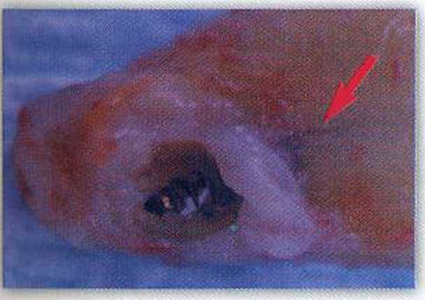 | Рис. 6. Корень зуба 25 после удаления. Наряду с перфорацией стенки канала анкерным штифтом имеется вертикальная трещина корня (красная стрелка) |
