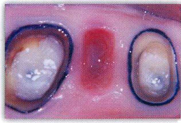 После удаления 25 зуба и проведения гемостаза прямым методом был изготовлен временный мостовидный протез (рис. 7а). Особое внимание было уделено промежуточной части протеза (рис. 76). Десневая поверхность промежуточной части временного мостовидного протеза была выполнена овоидной формы (ovate pontic), тщательно отполирована, обработана антисептиком и погружена непосредственно в лунку удаленного зуба. Важно проследить, чтобы десневая поверхность промежуточной единицы не давила на костные стенки альвеолы, но поддерживала десневой край, не оставляя зазоров между десной и промежуточной единицей мостовидного протеза. Сверху рекомендуется наложить десневую повязку. Через 4 недели формирование десневого ложа заканчивается и можно приступать к снятию оттисков (рис. 8).