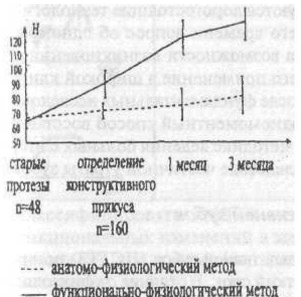 При повышении высоты прикуса у больного в первую неделю отмечается повышение тонуса покоя собственно жевательных мышц до 80-100 г (тонус физиологического покоя — 40 г) при одновременном снижении их тонуса сжатия до 50-70 г (тонус физиологического сжатия — 180-220 г). На второй неделе отмечается стабилизация указанных показателей с последующей нормализацией тонуса покоя и тонуса сжатия собственно жевательных мышц, которые к концу третьей-пятой недели приходят к исходным данным. Таким образом, в результате пользования накусочной пластинкой (разобщающим прикус аппаратом) происходит перестройка статических и динамических рефлексов разобщения прикуса, что обеспечивает увеличение межальвеолярного пространства, то есть новое состояние функционального покоя нижней челюсти. Клинически о завершении функциональной подготовки полости рта к протезированию можно судить и по ощущениям больного: удобно удерживать нижнюю челюсть в новом положении, в том числе при отсутствии накусочной пластинки или каппы в полости рта, прежнее положение нижней челюсти неудобно для больного (он его ищет, но не находит), отсутствие неприятных ощущений в области ВНЧС, появление смешанного типа жевания.