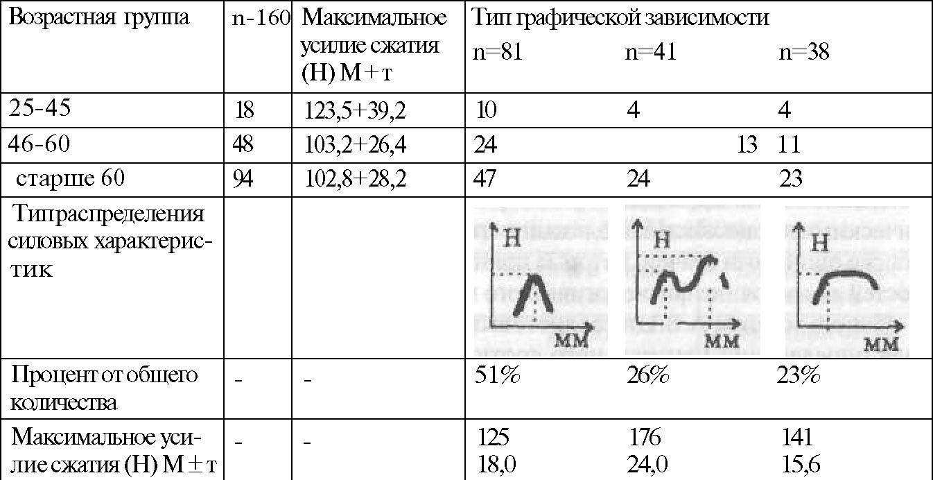 Показатели максимального усилия сжатия челюстей и типы распределения силовых характеристик у людей с полным отсутствием зубов различного возраста.