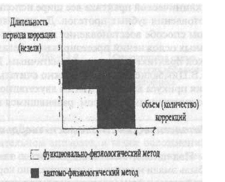 Рис. 31. Длительность и объем периода коррекции зубных протезов, изготовленных анатомо-физиологическим и функционально-физиологическим методами (по А.В.Цимбалистову, 1996)