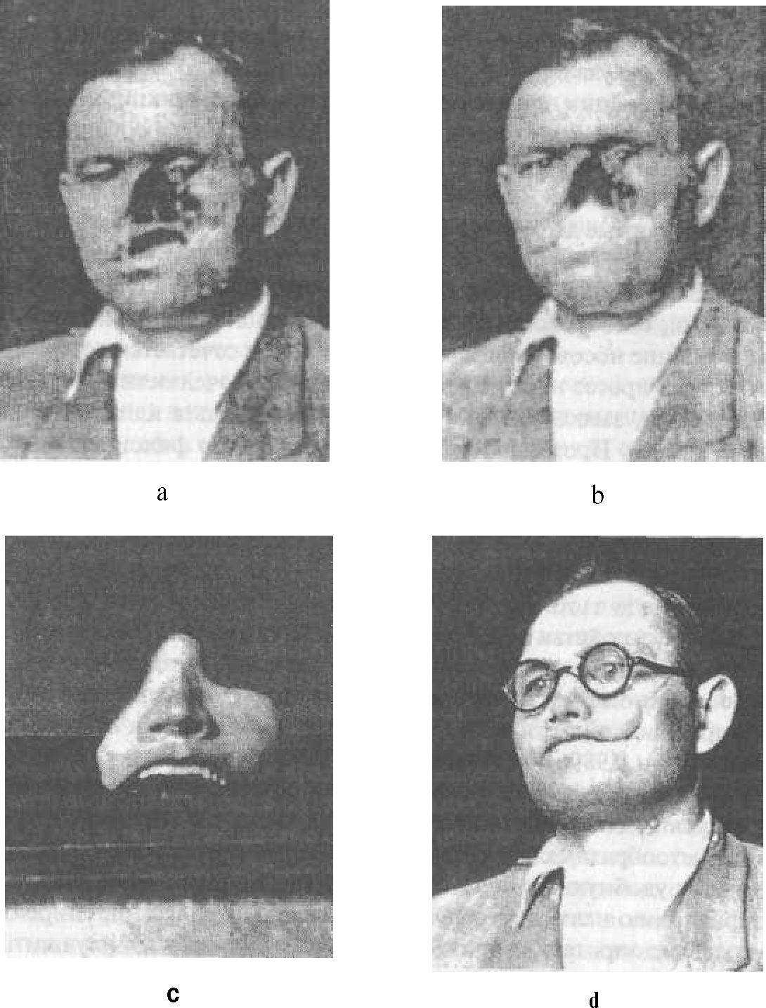 Рис. 45. Больной М. с послеоперационным дефектом верхней челюсти и лица (а); с надетым верхнечелюстным протезом (b); пластмассовый лицевой протез вместе с верхнечелюстным протезом (с); больной с надетым верхнечелюстным и лицевым протезами (d), на блюдение И.С.Рубинова