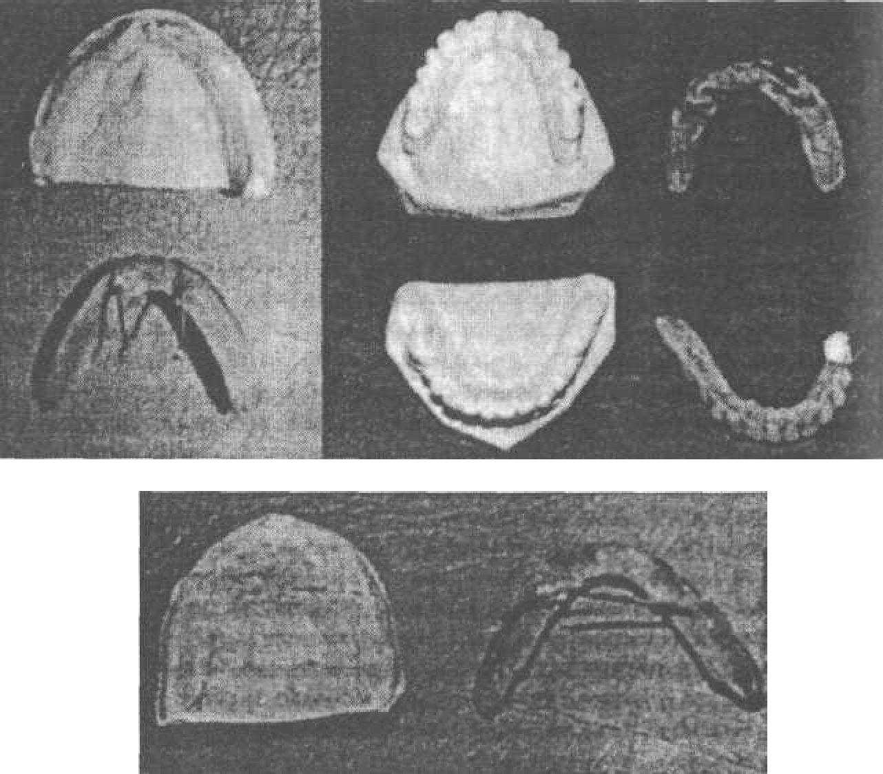 Рис. 46. Зубные протезы на «имплантатах», удаленные у больных в связи с развитием остеомиелитов челюстей и околочелюстных флегмон