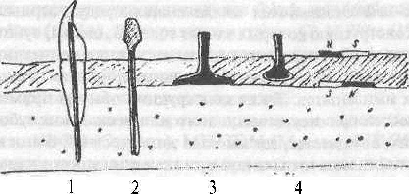 Рис. 47. Виды имплантации: 1 — эндодонто-эндоссальная; 2 — эндооссальная; 3 — субпериостальная; 4 — инсертимплантация (по О.Сурову)